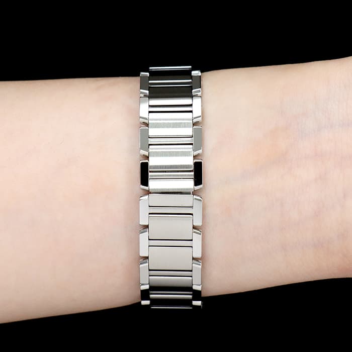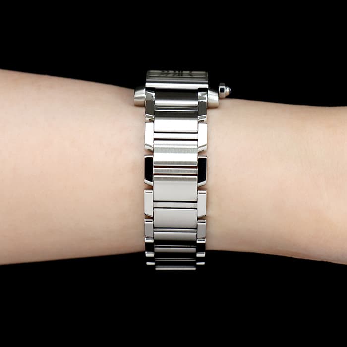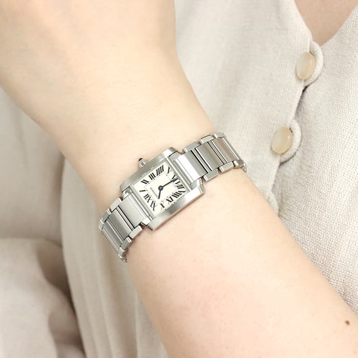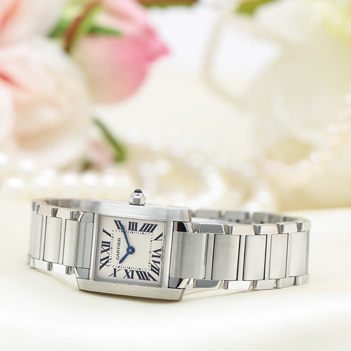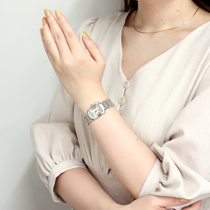 シンプルなホワイトダイヤルはまさに「一生もの」。安心の電池式ムーヴメントを搭載したタンクフランセーズは、女性に最も選ばれる時計の一つです。