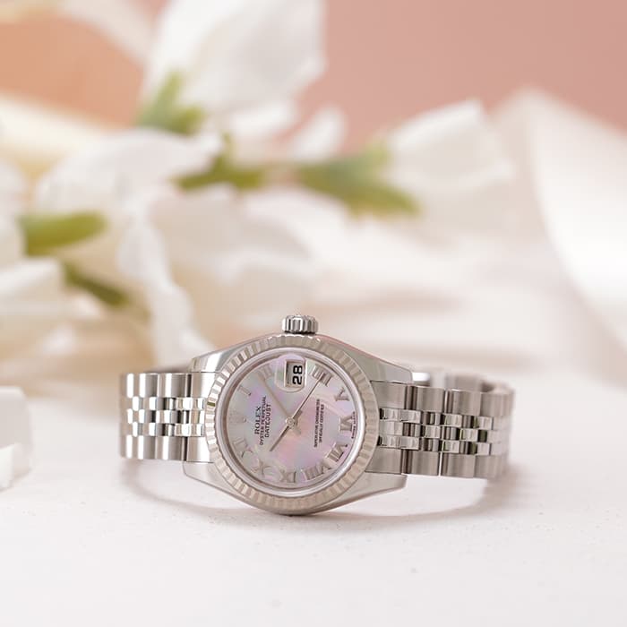 モデル名にもなった「デイトジャスト」機構が搭載されたドレス系シリーズの上級モデルです。