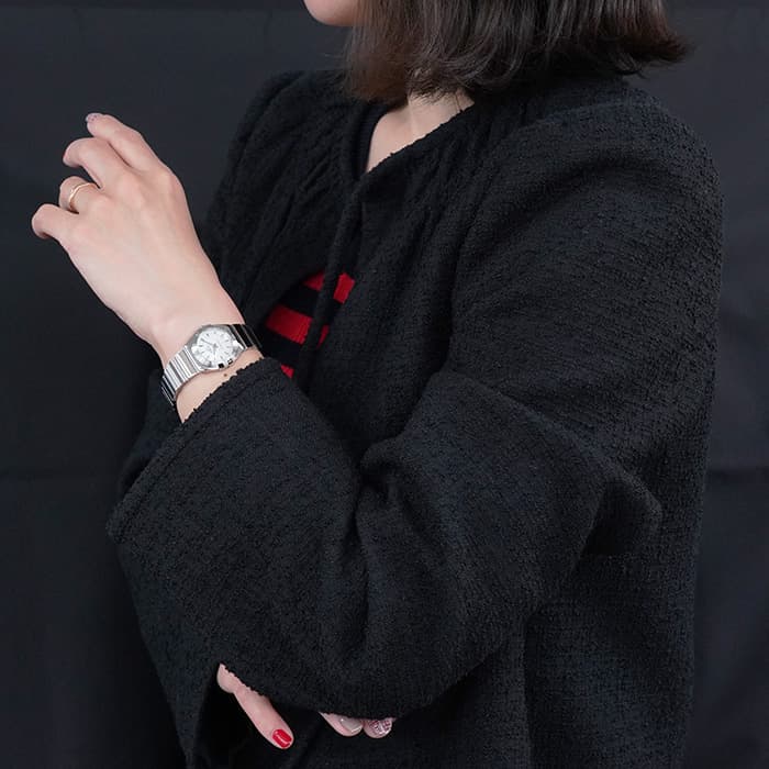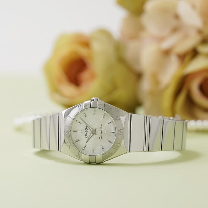 「星座」を意味するコンステレーションは、特徴的な4つの爪が配されたポリッシュされたケースに、6時位置の「星」が入っています。文字盤をアップにした写真でご覧いただけるシェルの質感が幻想的でフェミニンな手元を演出します。高い精度を目指してつくられたドレスラインの時計の象徴として時計の裏面には天文台のマークが入っています。オフィススタイルにもデイリースタイルにもオケージョンにも合わせやすいので1本持っていると重宝する時計です。
