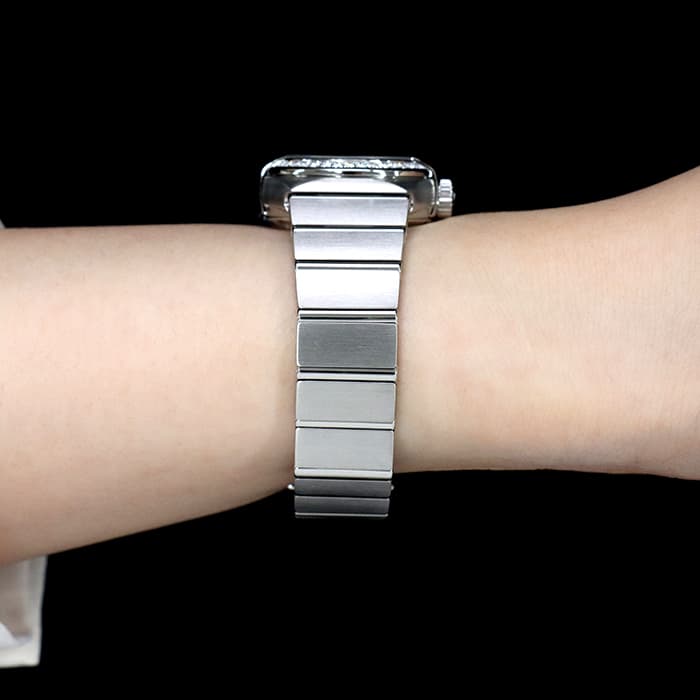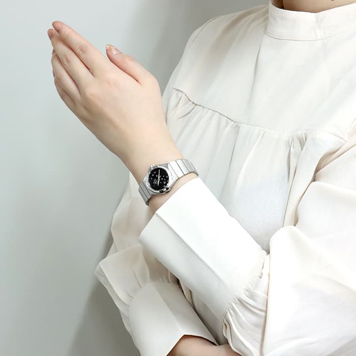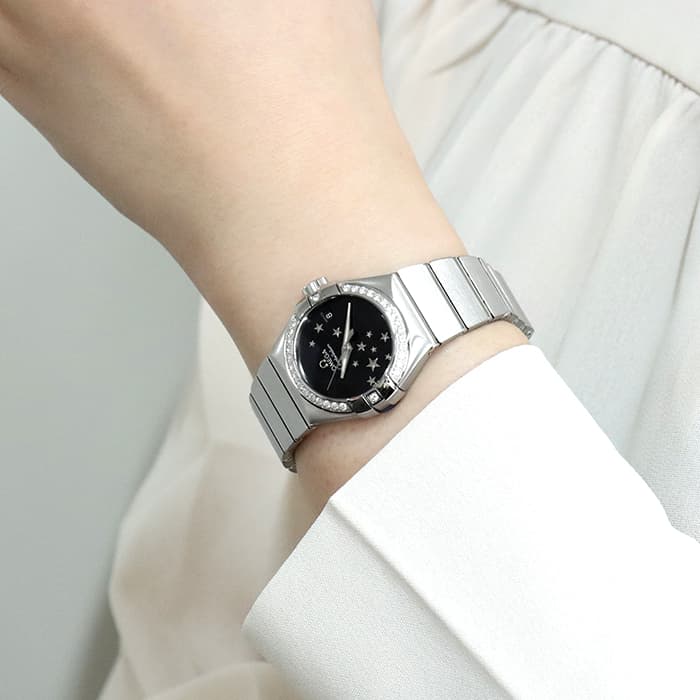 星座を意味する「コンステレーション」はオメガの不朽の名作。デイリーにご愛用頂きやすいステンレス素材のモデルです。角のない滑らかなケースやブレスレットは、スタイリッシュでモダンな女性の印象を与えてくれます。ベゼルにはダイヤモンドを贅沢にセッティング。ブラック文字盤に散りばめられた星がとても可愛らしいです。3時位置には日付表示も付いているので便利です。カジュアルでもビジネスでも、シーンを選ばずご愛用頂けます。ご自身へのご褒美にも、大切な方へのプレゼントとしてもおすすめです。