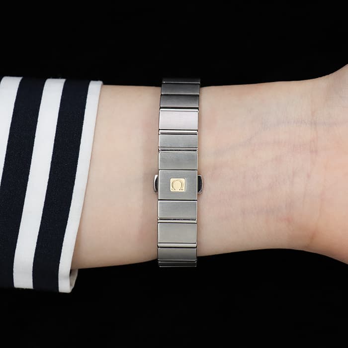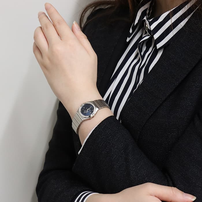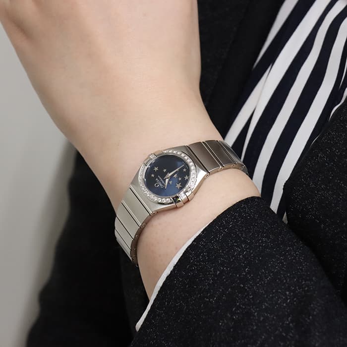 美しいステンレス製ケース&ブレスレットに、夜空を思わせる深いブルーの文字盤の組み合わせが、落ち着いた雰囲気を醸し出しています。こちらは、星座を意味するコンステレーションのモデル名にふさわしく、サンブラッシュ仕上げが施された文字盤にはホワイトゴールド製の星が10個ちりばめられ、きらめく星空をイメージさせる可愛らしいデザインに仕上がっています。