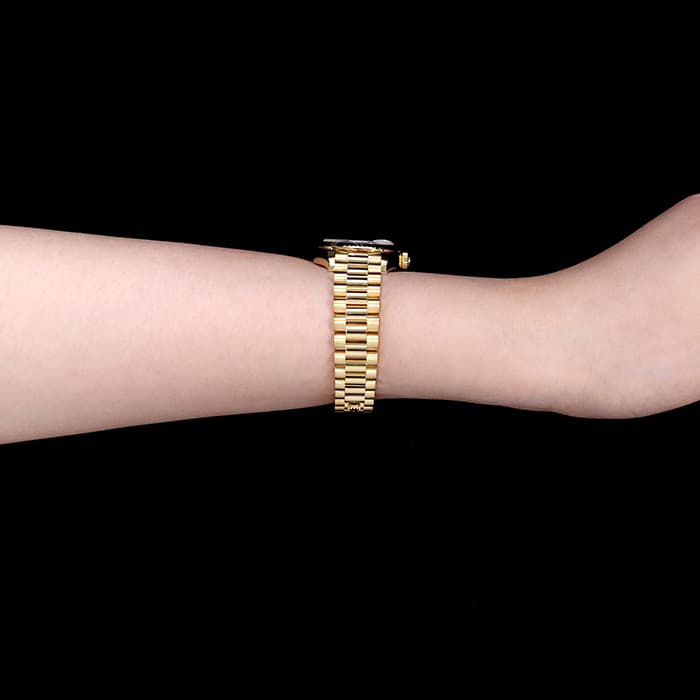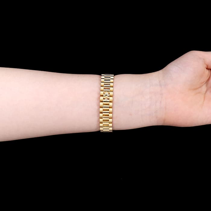 フルーテッドベゼルが光を反射してキラキラとした様子にブレスレットの輝きが加わり、