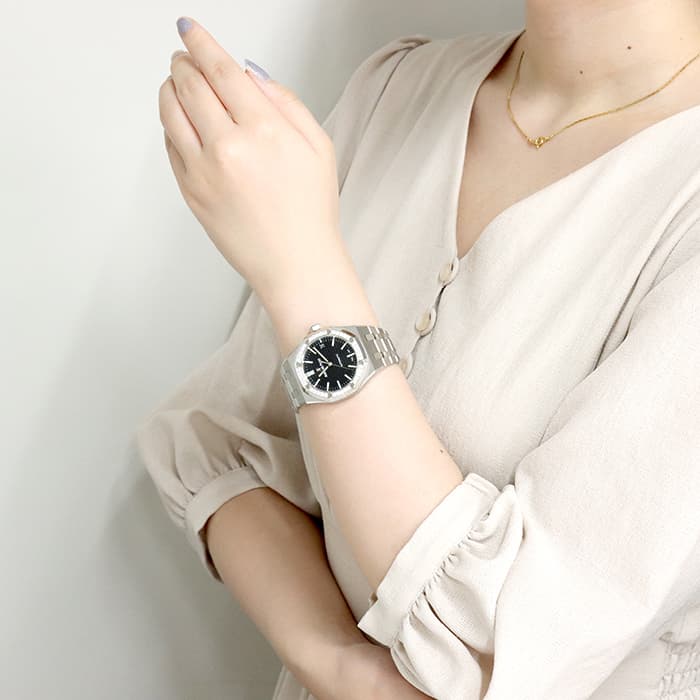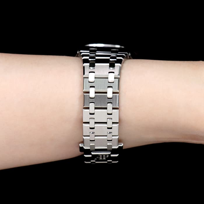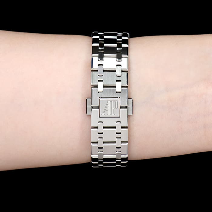 パテックフィリップ、ヴァシュロンコンスタンタンと共に、世界三大高級時計メーカーのブランド「オーデマピゲ」からリリースされた人気モデル「ロイヤルオーク」。こちらは自動巻きムーブメント搭載のケースサイズ37mmのモデルです。 ケースとブレスレットに使用している素材はステンレスのみですが、ベゼルのビスにホワイトゴールドを使用することで、ラグジュアリースポーツを体現する、高級感あふれるエレガントなデザインとなっています。ベゼルにはダイヤモンドをセッティング。マニッシュなデザインがコーディネートを魅力的に彩ります。