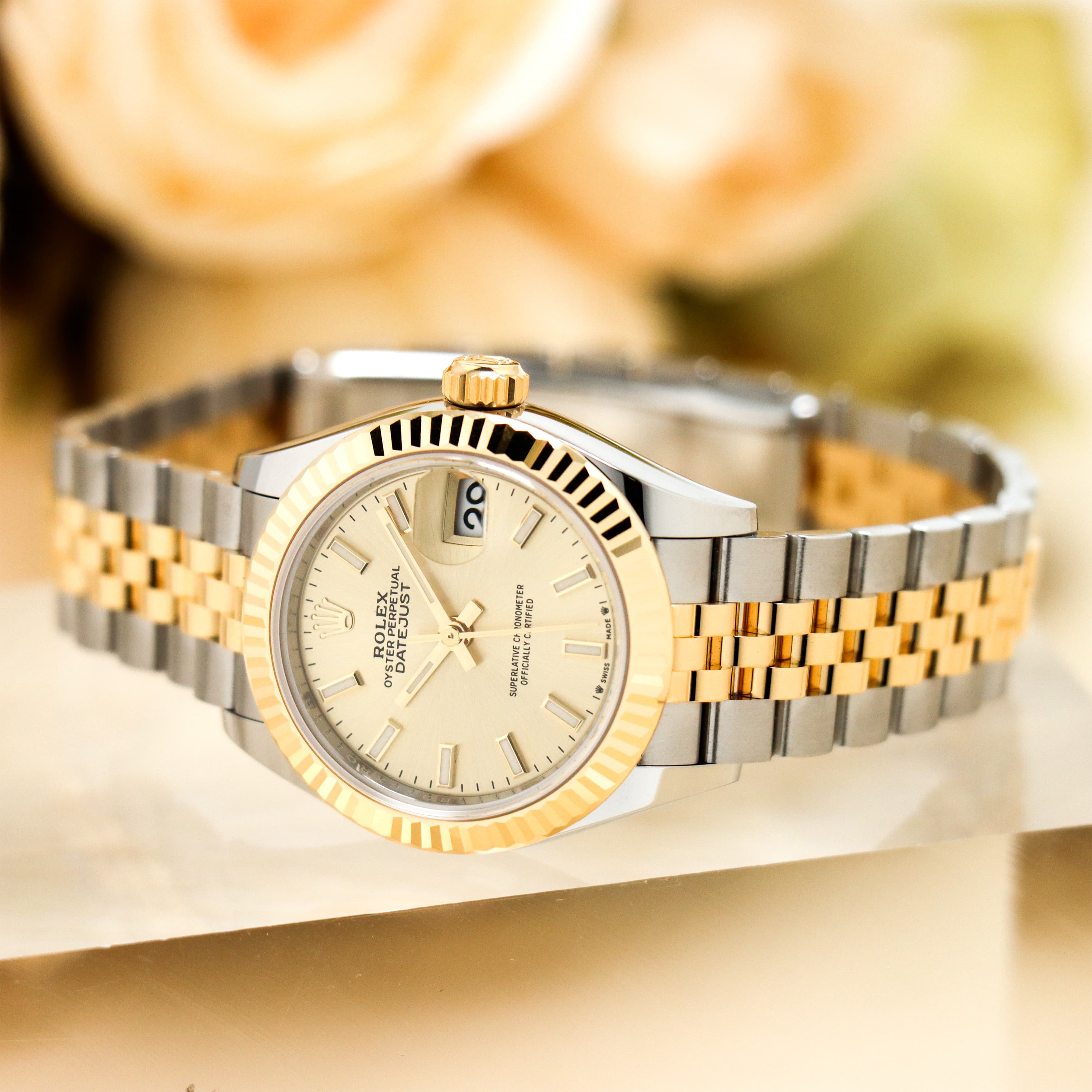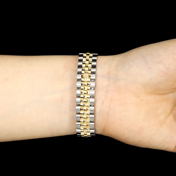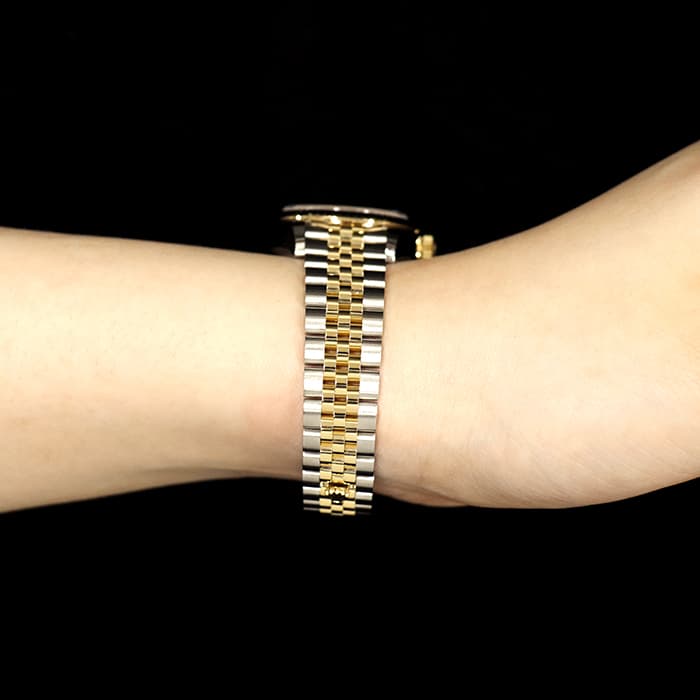 28mm径のレディ デイトジャストは女性の美しさを最大限に引き出す流れるようなラインのエレガントなデザインとなっています。