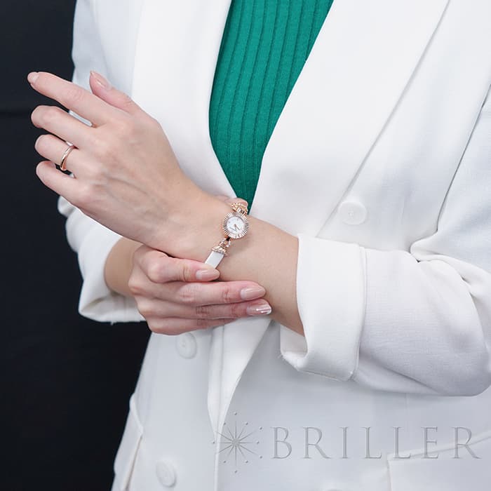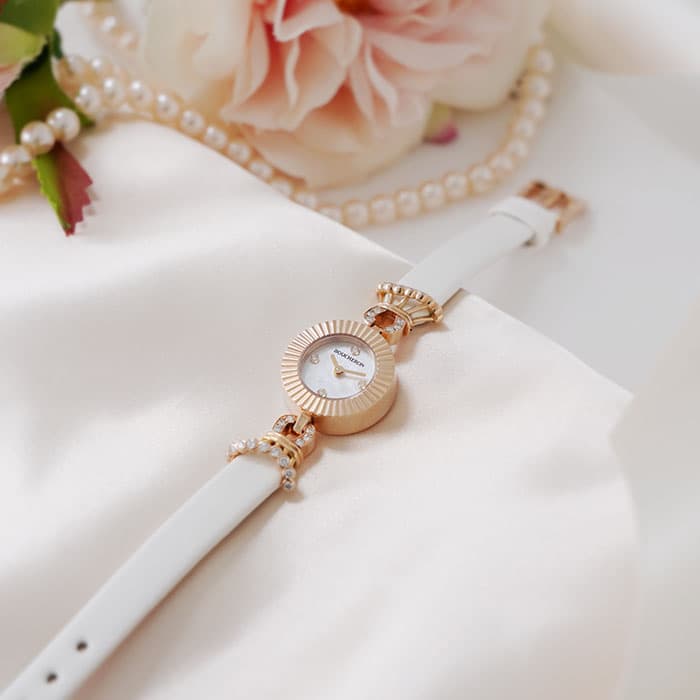 18mmのピンクゴールドケースはまさにジュエリーを思わせるデザインで、