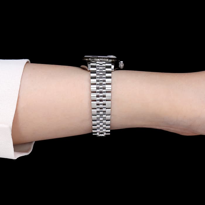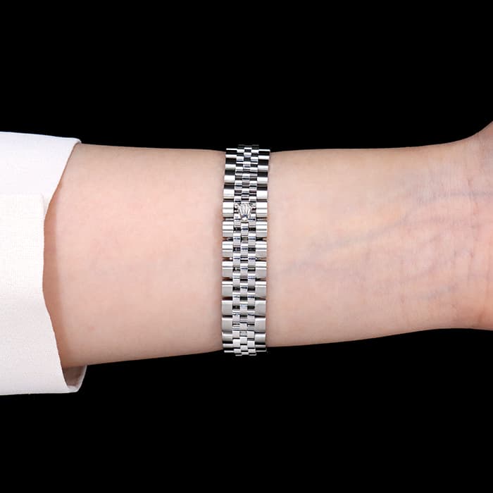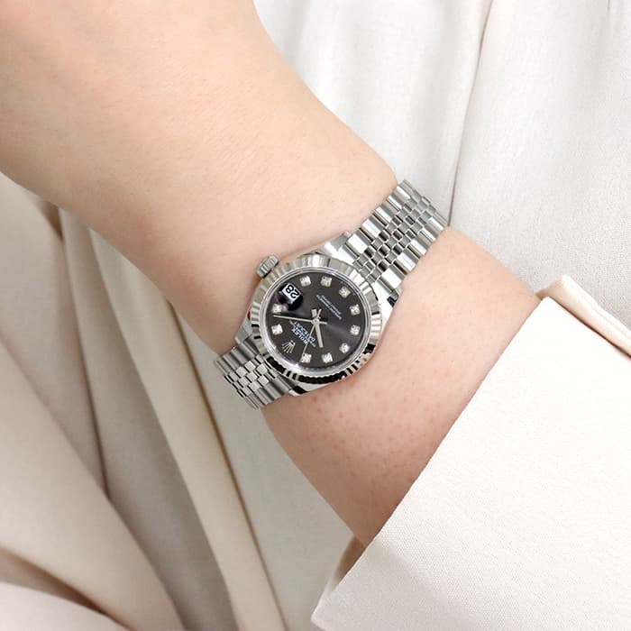 1945年に初登場してから、流行に左右されない普遍的なデザインにより、ロレックスを代表する存在となった「デイトジャスト」コレクション。 女性の美しさを最大限に引き出す数あるデイトジャストのダイヤルデザインの中でも、落ち着いたダークグレーの文字盤にダイヤモンドインデックスの組み合わせは、小さなレディースモデルでもしっかりと視認性とリッチな雰囲気を漂わせる仕上がりとなっています。 文字盤を囲むフルーテッドベゼルのきらめきが表情に変化を付け、ドレッシーな装いにもビジネススタイルの装いにもコーディネートできる腕時計です。 ムーブメントには完全自社製造の自動巻きキャリバー「Cal.2236」を搭載。 ロレックスが特許を取得したシリコン製シロキシ・ヘアスプリングを備えたこのムーブメントは、非常に高い精度を保つように設計されています。
