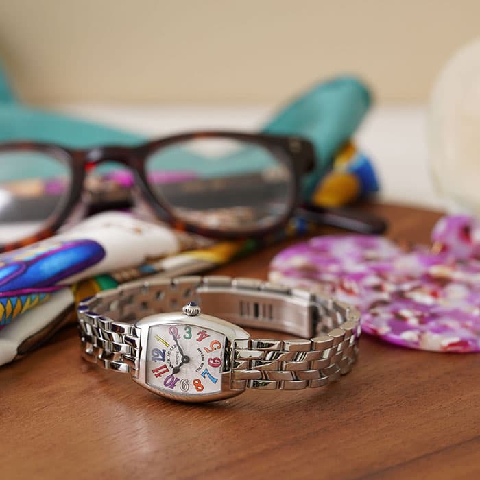 華やかな彩りのインデックスが時計を見るたびに明るい気持ちにさせてくれます