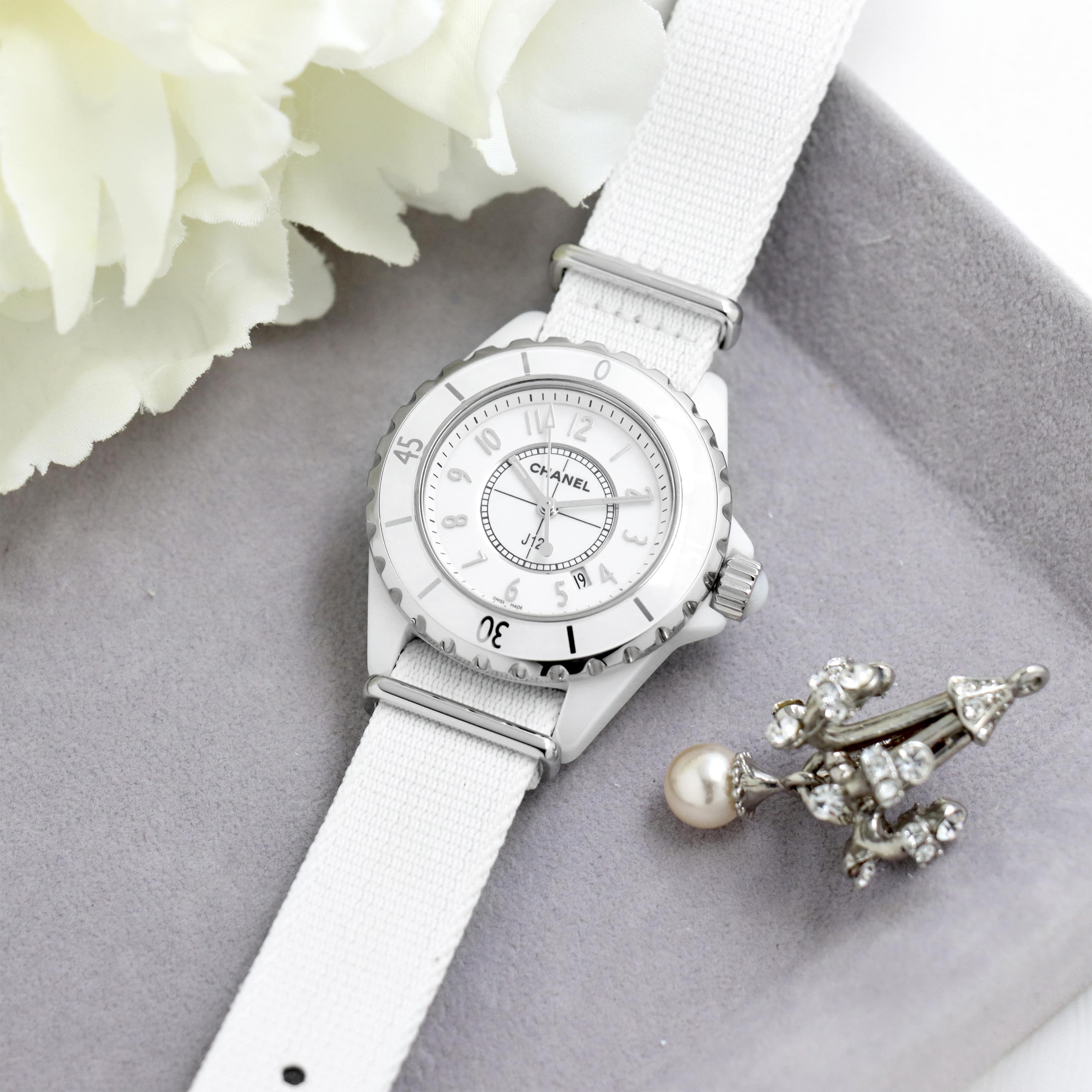 CHANEL シャネル J12-G.10 GLOSS 33mm H4656人気のJ12にホワイトカラーのナイロンストラップを装着した日本未発売のモデル。レザーストラップも替えベルトとして付属するので、季節や洋服に合わせて楽しめる時計です。視認性も高く軽量で、セラミックケースを使用しているので、傷がつきにくく、時計としての質も高く仕上がっています。スポーティさとエレガントな雰囲気を併せもつ、カジュアルな服装にもフォーマルな服装にも両方あわせられるデザインです。 シャネル 時計の買取り・下取りも行っておりますので、お気軽にご相談ください。