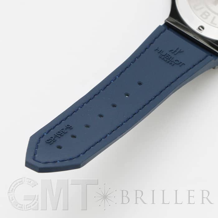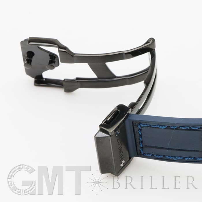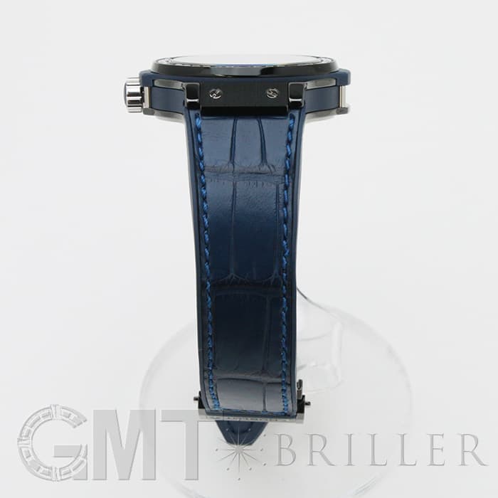 ブルーのアリゲーターにラバーを組み合わせたベルトがマッチしていて、スポーティながらもラグジュアリー感溢れる独創的な仕上がりはウブロならではです。