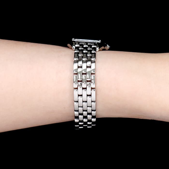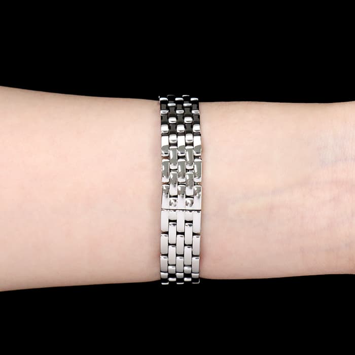 特徴的なスクエアケースに5連ブレスは腕にフィットし付け心地が良く、また、光を反射しキラキラと輝くためジュエリーのような華やかさを持っています。ベゼルにダイヤをセッティングしたエレガントなモデルです