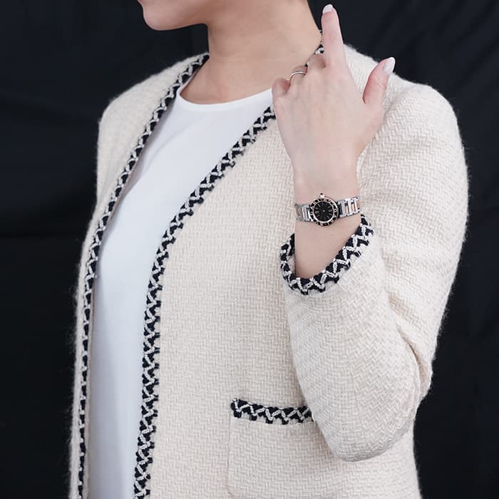 腕元に凛としたアクセント、美しく映えるモデルで、ステンレス素材とピンクゴールド素材が使用されています。