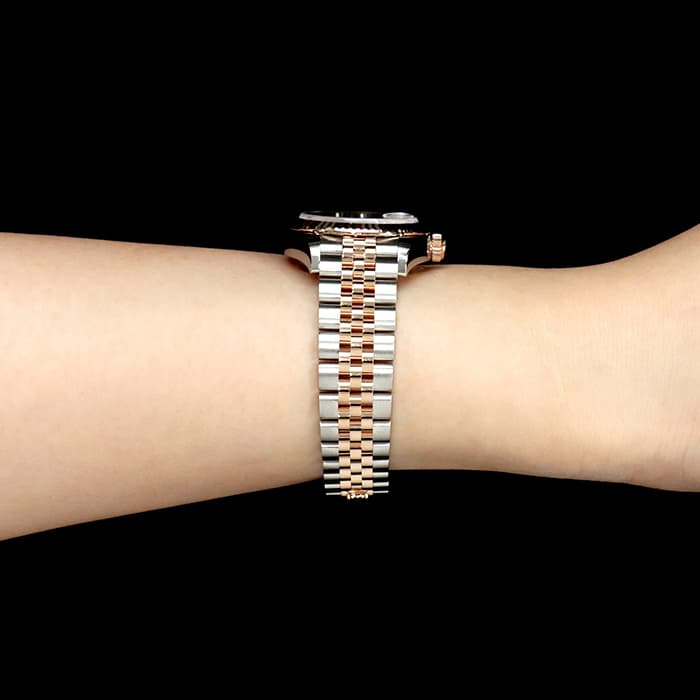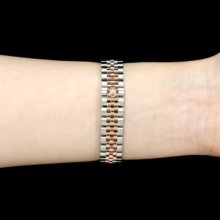 1945年に初登場してから、流行に左右されない普遍的なデザインによりロレックスを代表するモデルとなったデイトジャスト。28mm径のレディ デイトジャストは女性の美しさを最大限に引き出す流れるようなラインのエレガントなデザインで、エバーローズゴールドとのコンビで品格ある雰囲気が漂います。