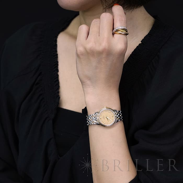 ローマインデックスや針、ベゼルなどに使用されているイエローゴールドと、ステンレススチールのコンビネーションが美しく、ラグジュアリーな雰囲気を醸し出しています。