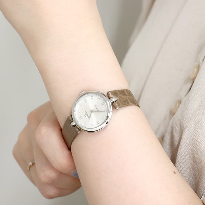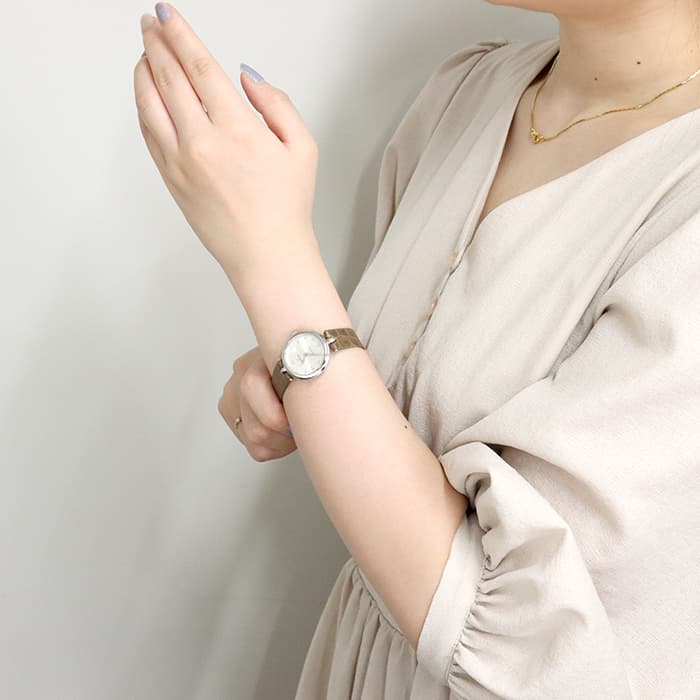 ラウンドケースの洗練されたデザインが人気の「デ・ヴィル」コレクション。その中でも「プレステージ デュードロップ」は、雫の形をした華奢なラグが特徴のシリーズです。シルバー文字盤に8ポイントのダイヤモンドが輝き、手元をドラマティックに彩ります。グレージュカラーのレザーベルトが可愛らしい大人の手元を演出します。ケースにはデイリーに使いやすいステンレス素材を採用。クォーツ式ですのでアフターメンテナンスも簡単です。おしゃれな腕元を作り上げるおすすめの腕時計となっています。