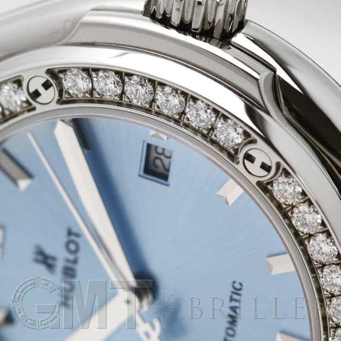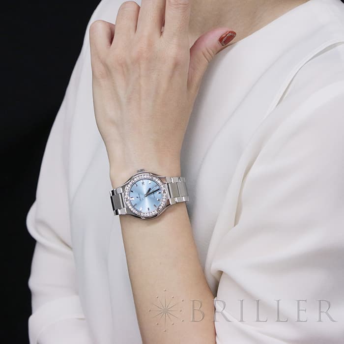 新たにコレクションに加わったライトブルーのダイヤルはダイヤモンドベゼルとの相性が非常によく、