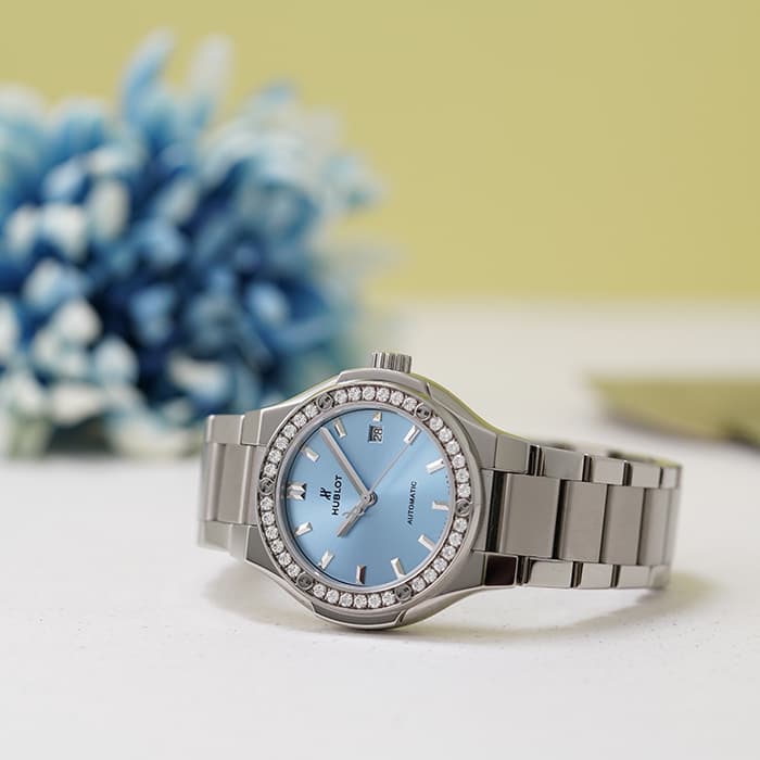 HUBLOT ウブロ クラシック フュージョンチタニウム ブレスレット ライトブルー 33mm 585.NX.891L.NX.1204
