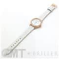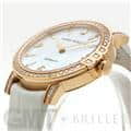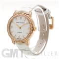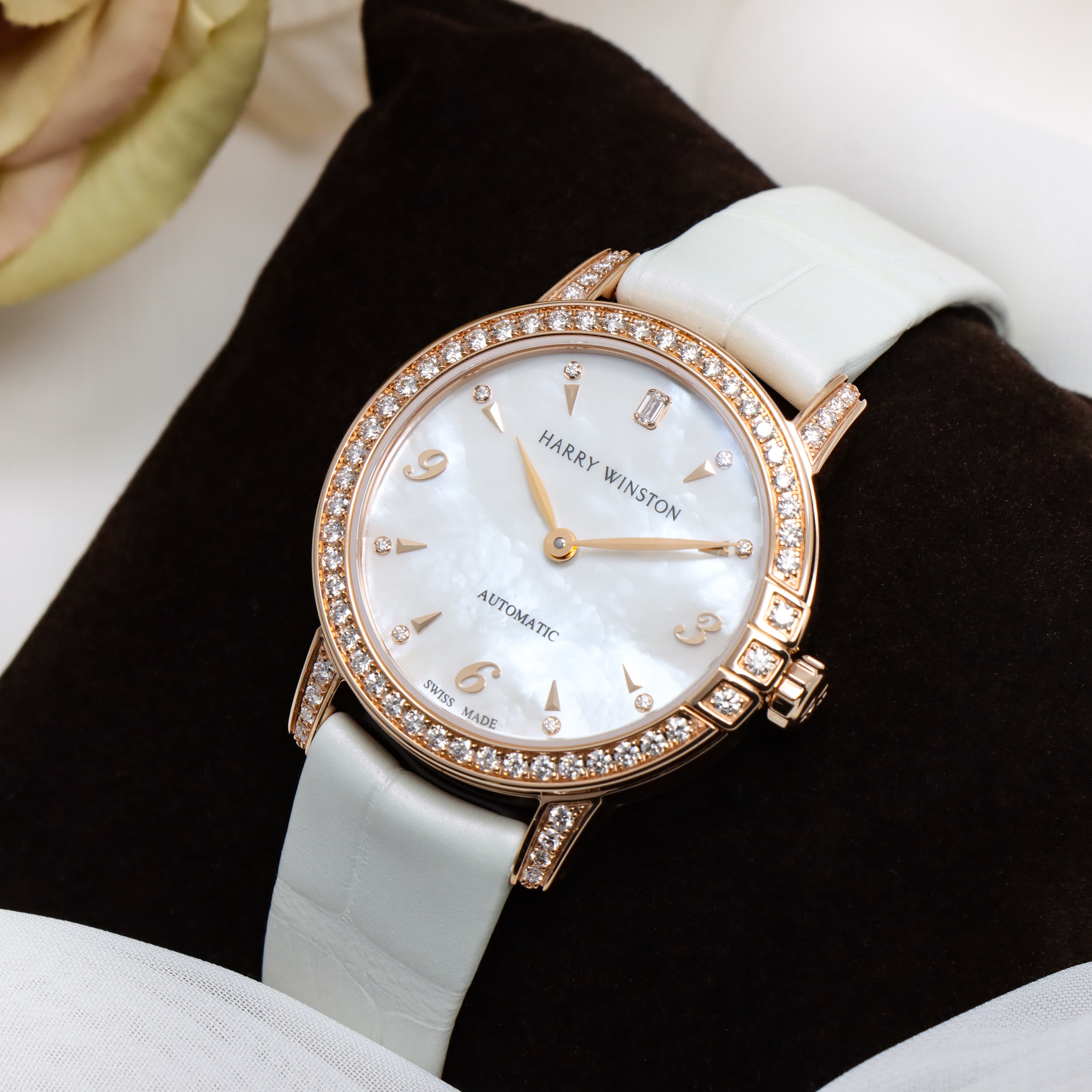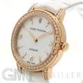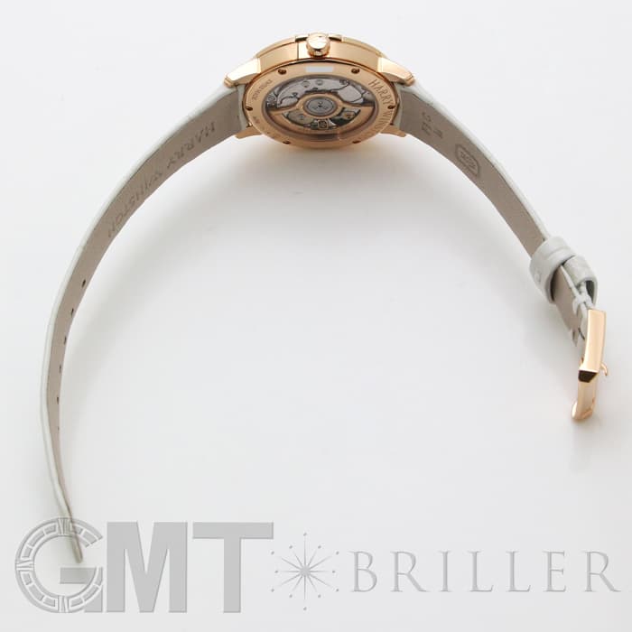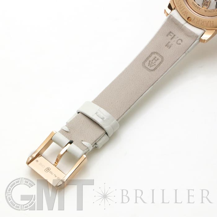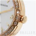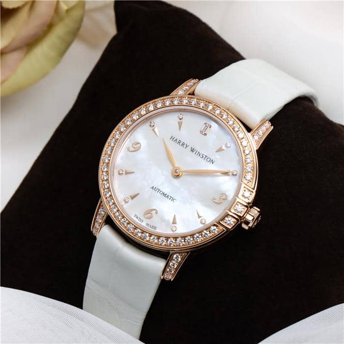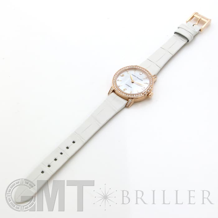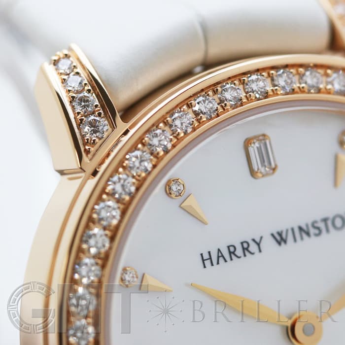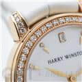 伝統を取り入れたクラシックなデザインが特徴のミッドナイトコレクションです。ローズゴールド製のラウンドケースやラグにはブリリアントカットのダイヤモンドを、ホワイトのマザーオブパールの文字盤には8ポイントのブリリアントカットダイヤモンド、さらに12時の位置にはハリーウィンストンのロゴにも使用されている美しいエメラルドカットのダイヤモンドがセッティングされているラグジュアリーなレディースウォッチです。