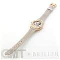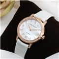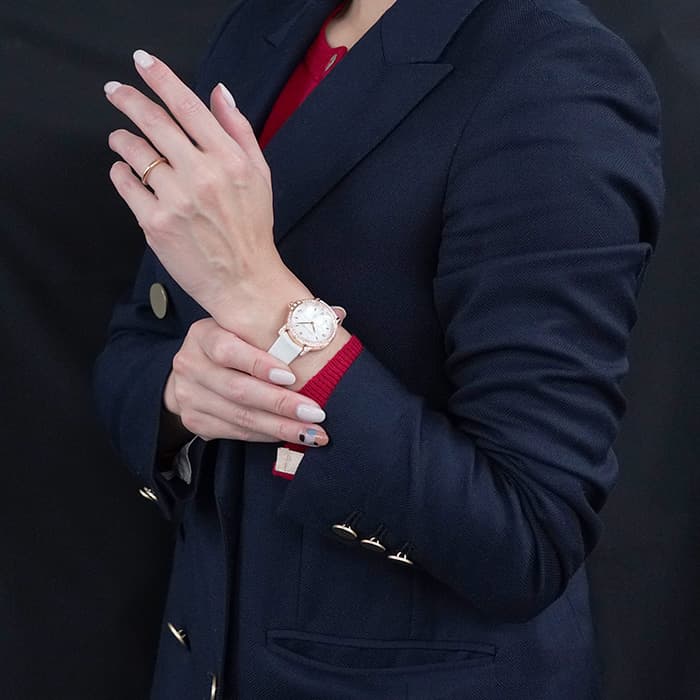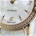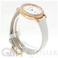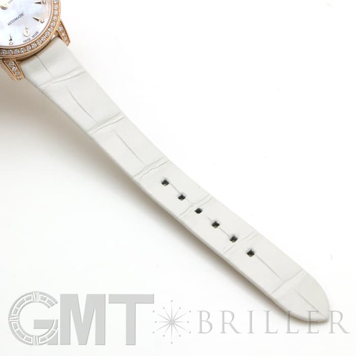 やや光沢のあるホワイトパール・アリゲーターレザーが時計本体の美しさを際立たせ、手元から輝きを放ちます。