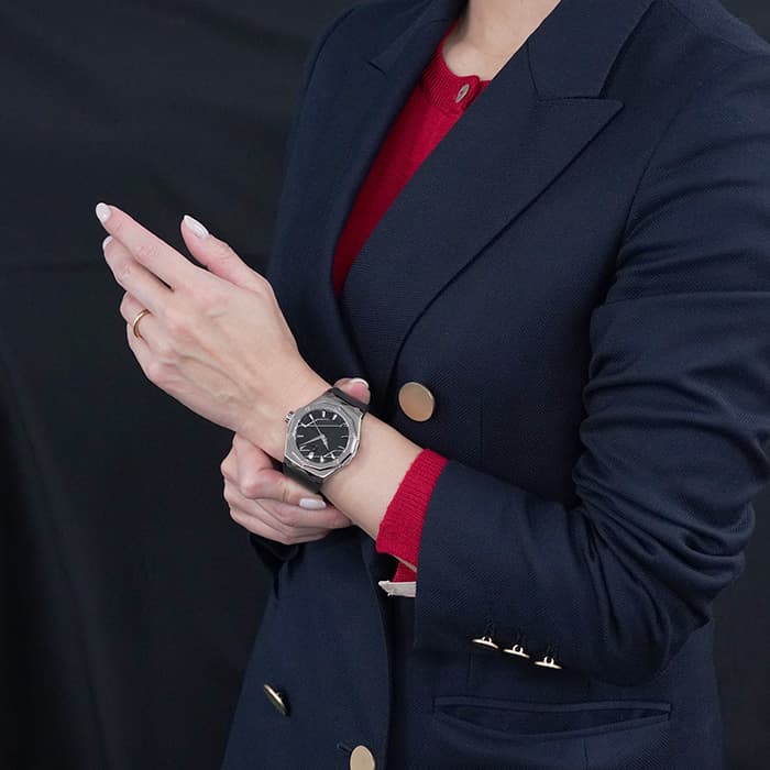 今回のモデルはケースやプッシュボタンから針だけでなくダイアル自体にもファセットが施され、光の反射で様々な表情を見せてくれます。