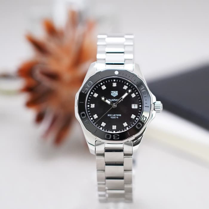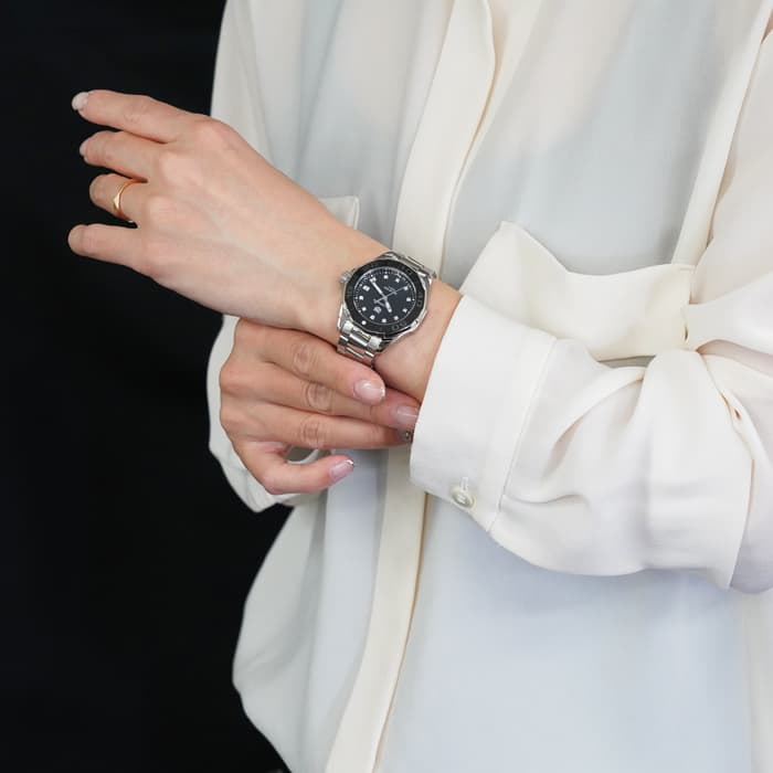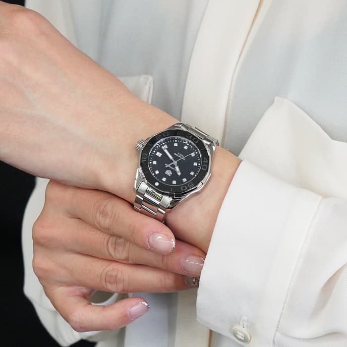エレガントとカジュアルが融合したモデル「アクアレーサー」で、文字盤にはブラックシェル素材を採用。