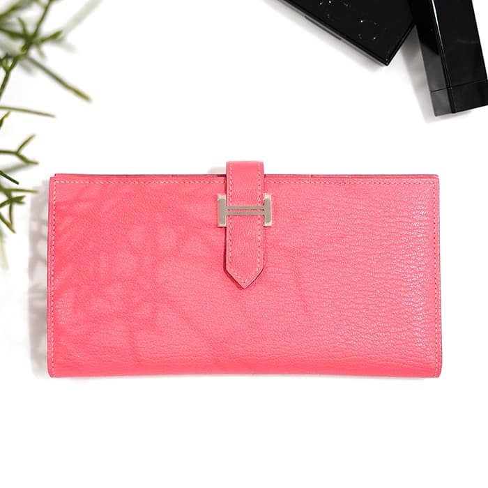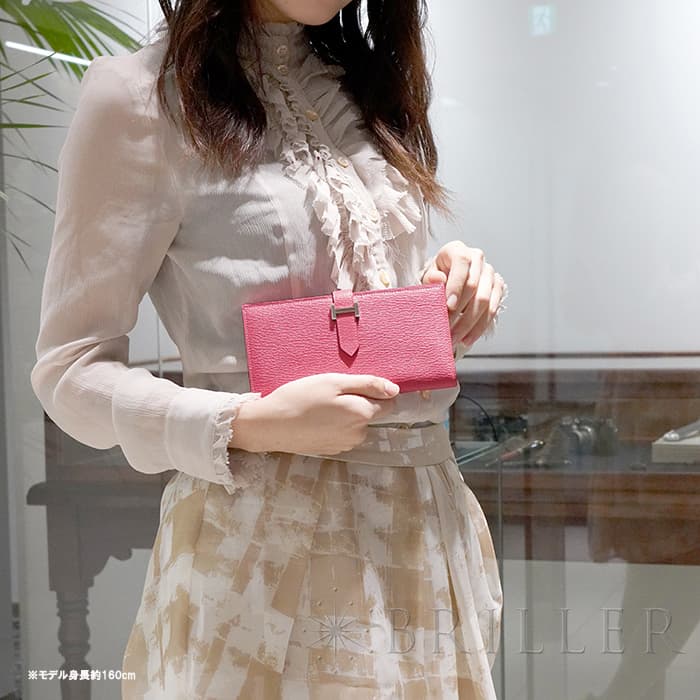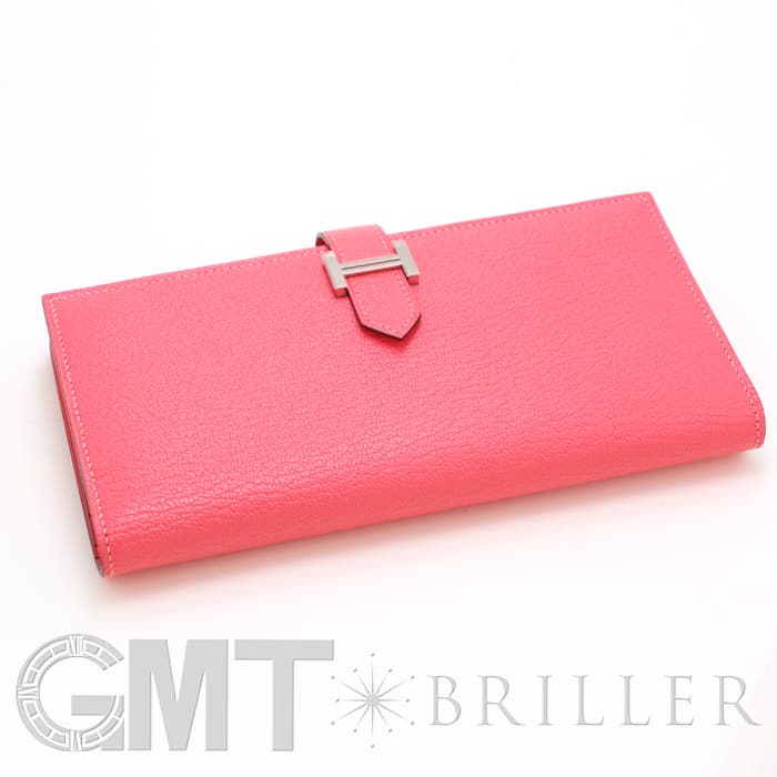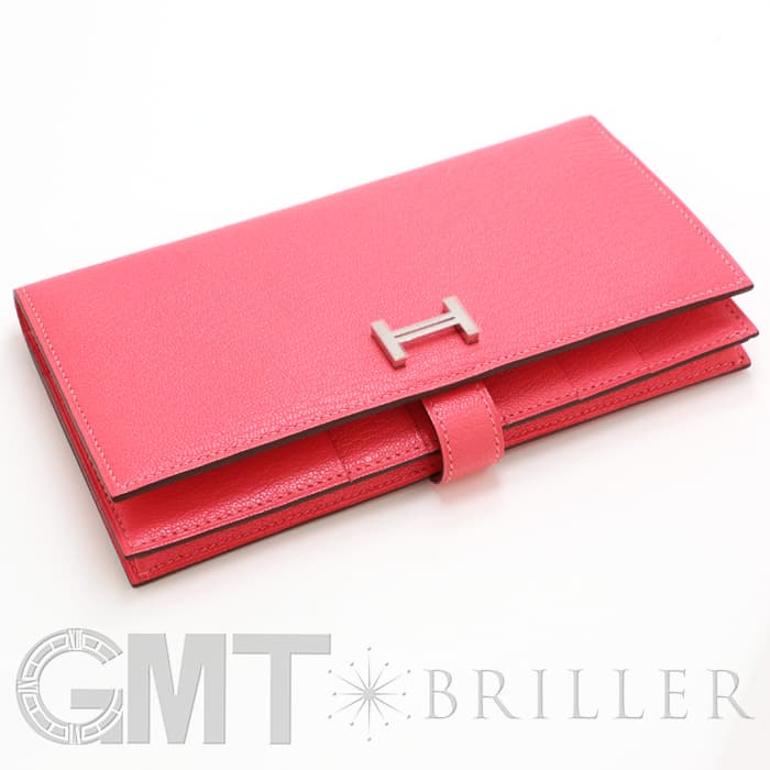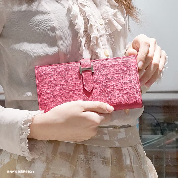 フランス西部の「ベアン」が由来の「ベアンスフレ」その特徴はエルメスの代表的なデザイン「Hマーク」の留め具。札入れ部分はマチ付きタイプとなり紙幣、チケットなどの収納に便利です。実用性の高さと上品さを兼ねそろえたラグジュアリーウォレットとなっております。スモールレザーグッズの中でもエルメスの代名詞といえるベアンシリーズです。「アザレ(azalee)」は、日本でもおなじみの植物・ツツジのことです。こちらのカラーはエルメスの中でも人気色で、定番のブラックやエトゥープは手に入りやすいですが、この色味はレギュラーカラーではないので希少です。素材は「シェーブル」山羊革で、天然の風合いを大切にしており、軽く、キズに強いので小物に多く起用される素材です。発色も美しく、「ローズアザレ」の色味を最大限に引き出しております。金具の色はシルバーで、可愛らしさの中に凛とした大人の雰囲気がございます。2016年製造のX刻印、新品のお品物です。