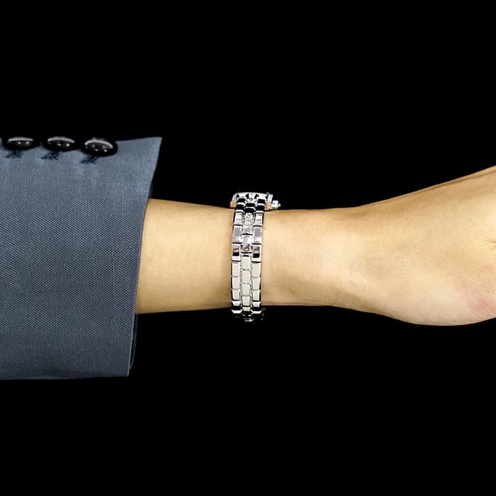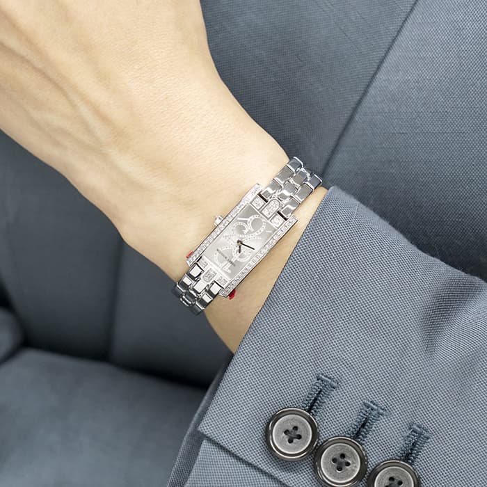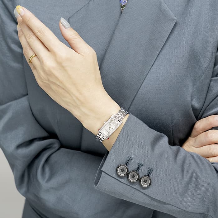 重厚感のあるホワイトゴールド製のブレスレットやケースがしっとりと腕に沿い、