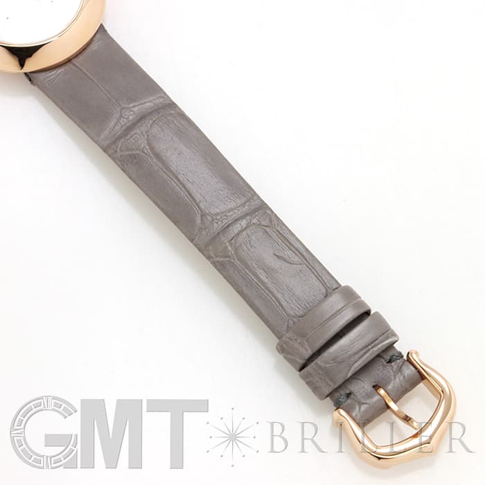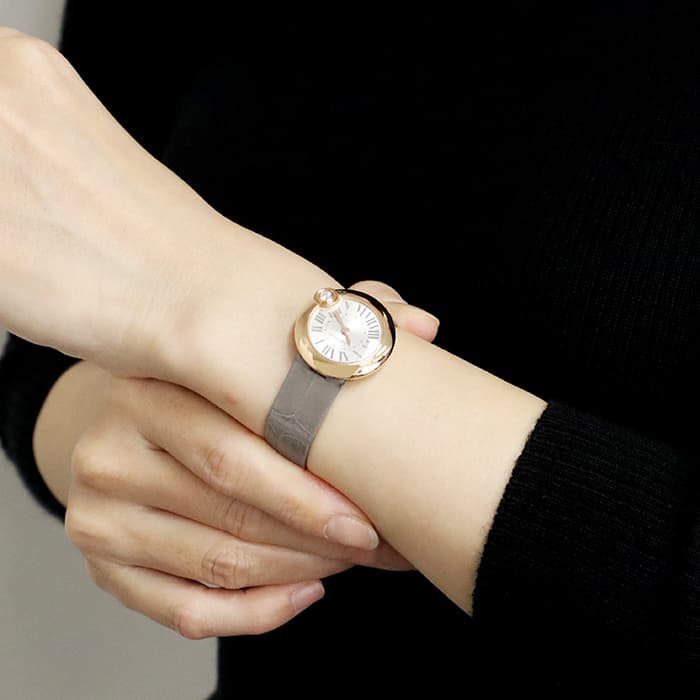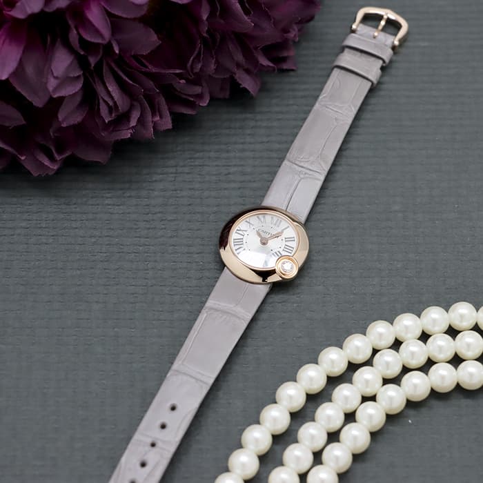 ケースの形状は人気モデル『バロンブルー』の優しい丸みを継承しつつ、リューズ位置を4時位置にすることで優雅な雰囲気になっています。リューズガードには0.15ctのダイヤモンドがセットされ、サンレイ仕上げのシルバー文字盤にはポリッシュ仕上げのシルバーインデックスとピンクゴールドカラーの針が洗練された、上品で統一感のあるデザインを演出しています。ピンクゴールドのケース素材と1粒のダイヤモンド、セミマットライトグレーのアリゲーターの高級感ある革ベルトの組み合わせで、控えめでありながら上質感を味わうことのできる大人のためのレディース腕時計です。