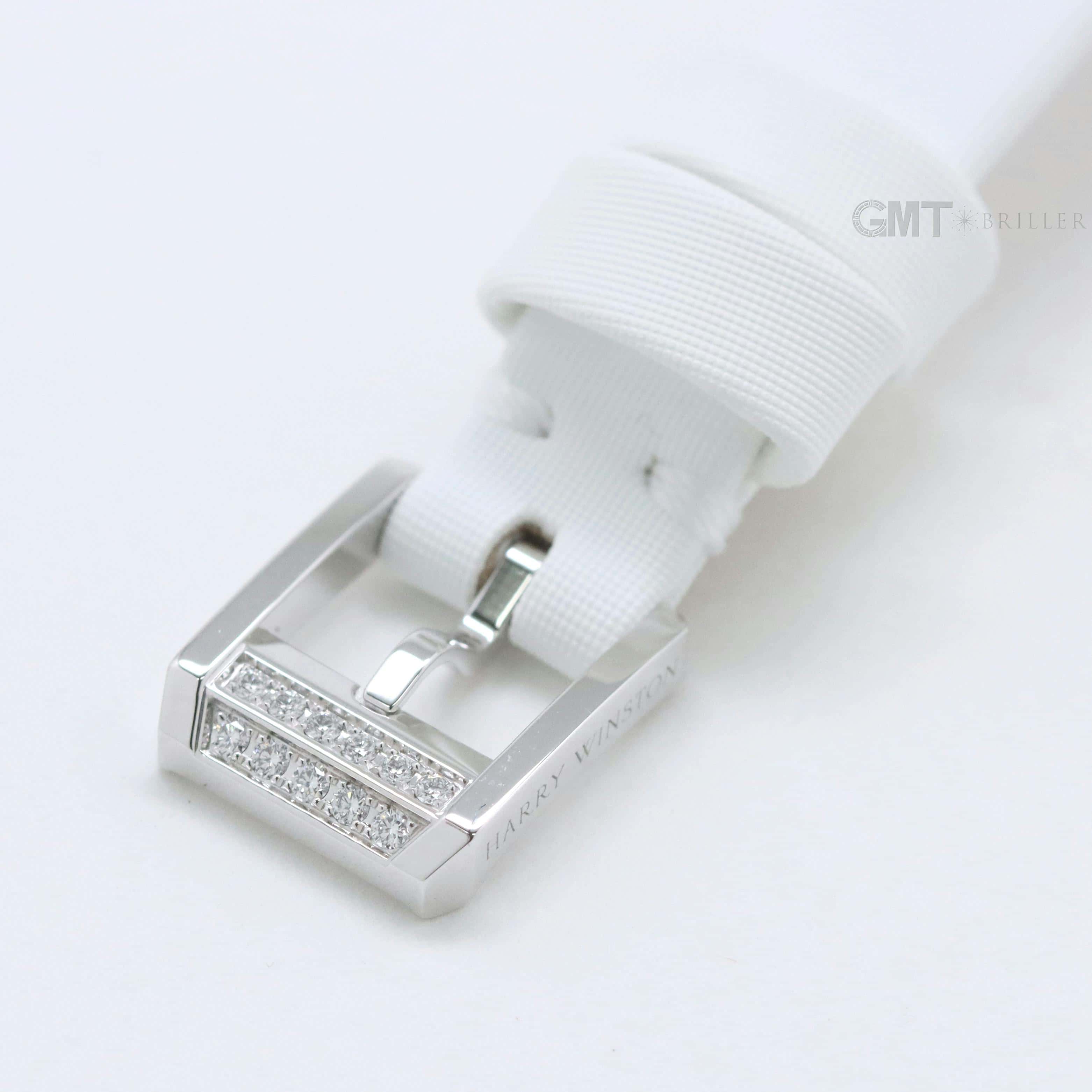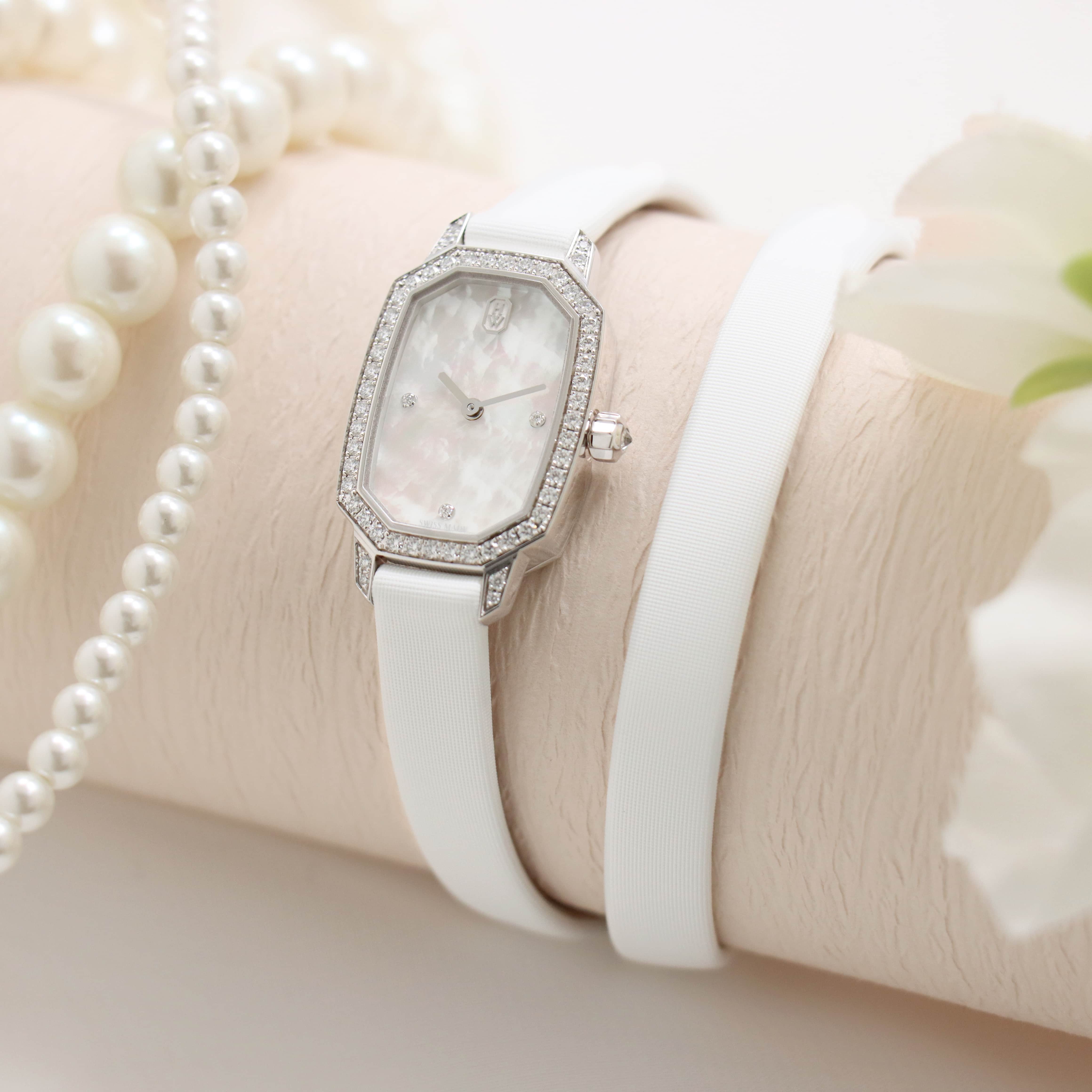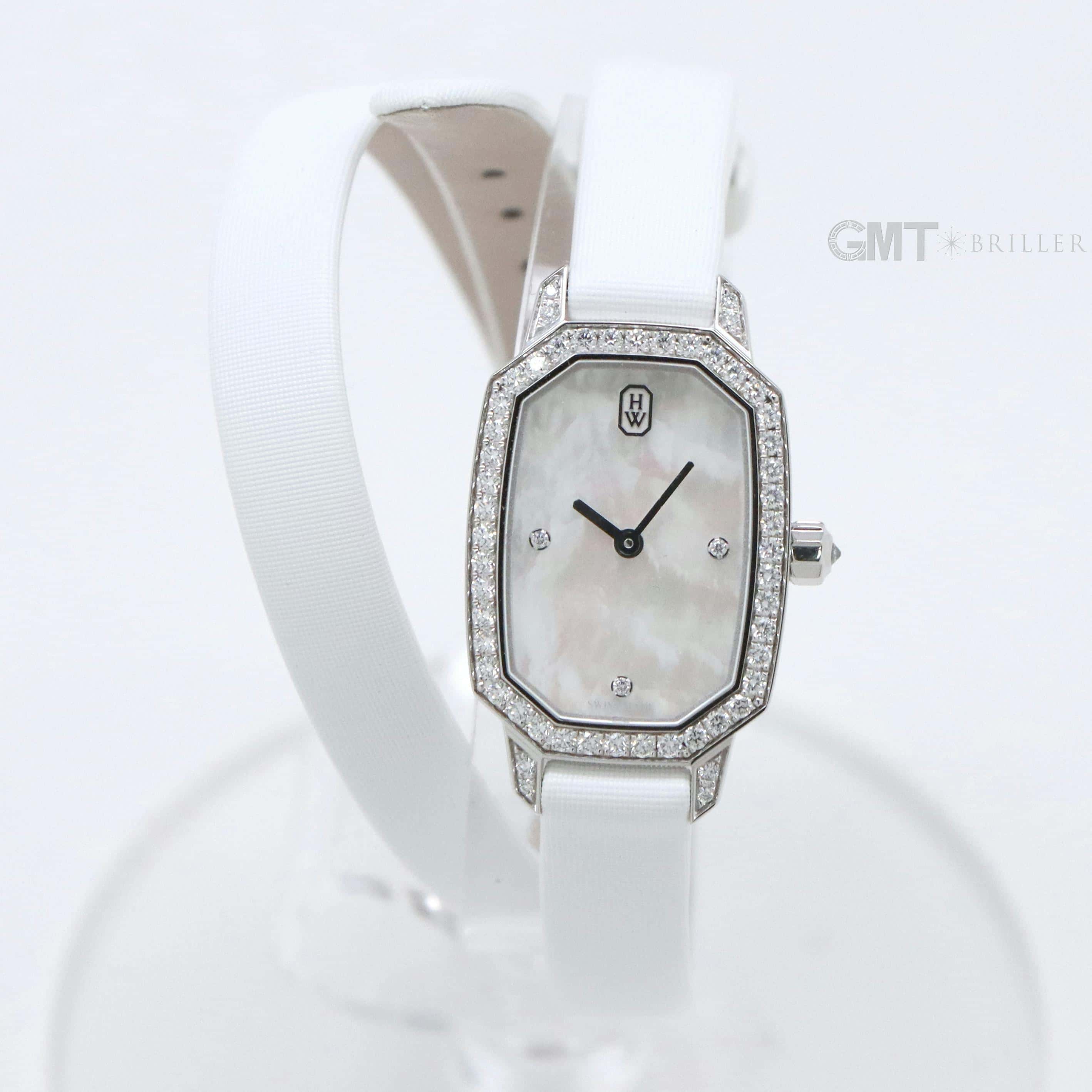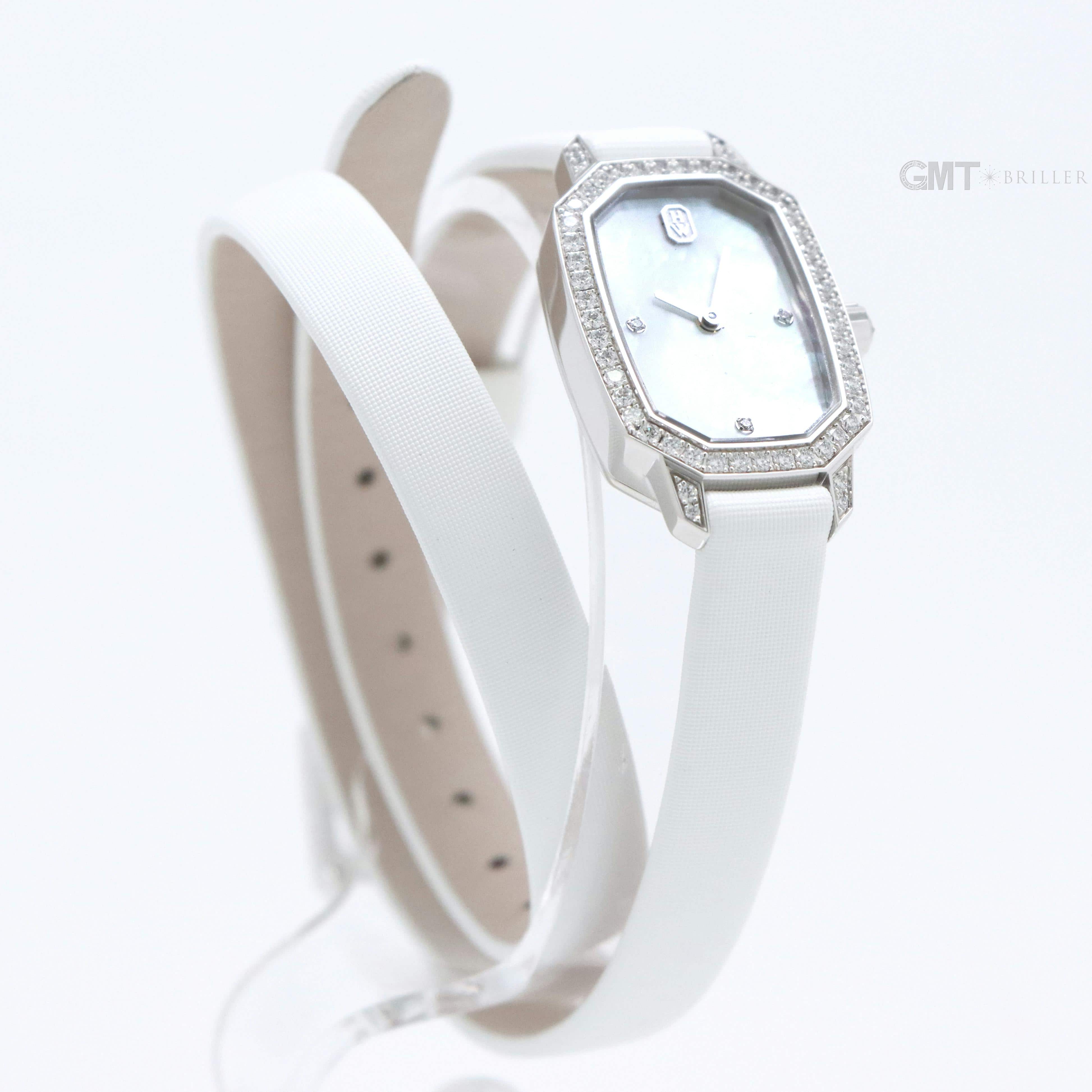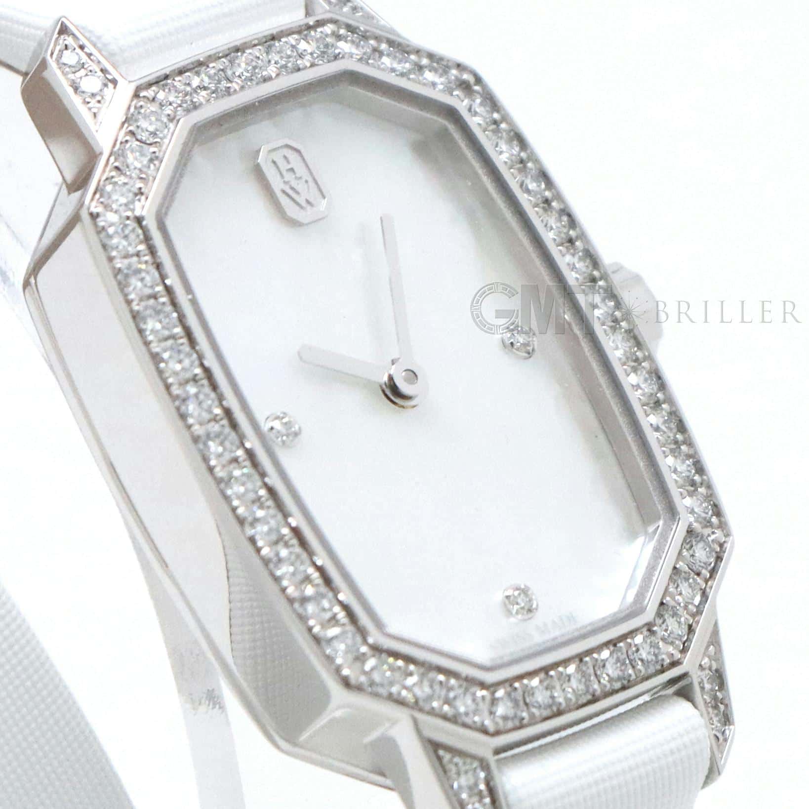 エメラルドは創始者であるハリーが最も愛したというダイヤモンドカット、 『エメラルドカット』からインスパイアされたコレクションです。 控えめなサイズながら、ホワイトゴールドケースや文字盤、尾錠にいたるまで 67個の約0.53カラットのダイヤモンドが散りばめられた非常に美麗なモデルです。 艶やかな光沢を湛えたホワイトシェルの文字盤が手元を可憐に彩る、淑女のための腕時計です。