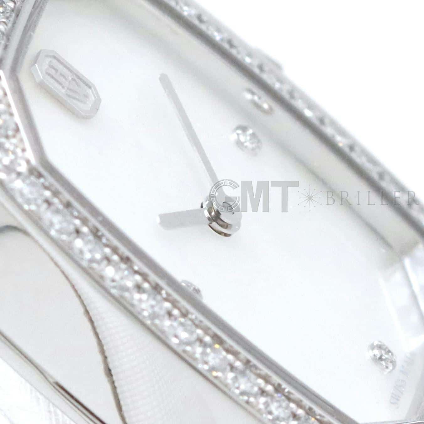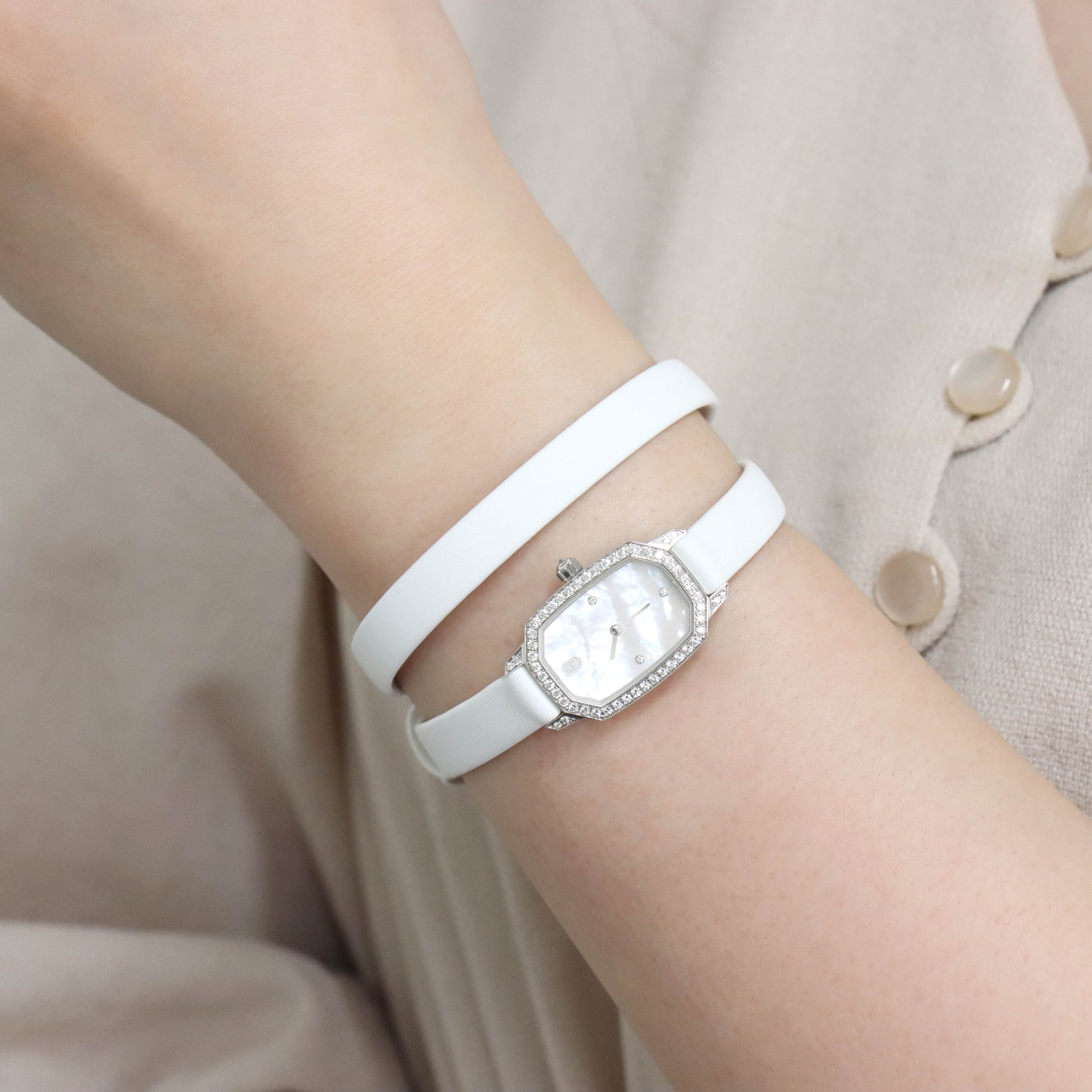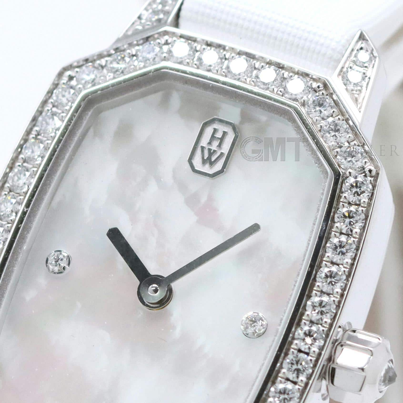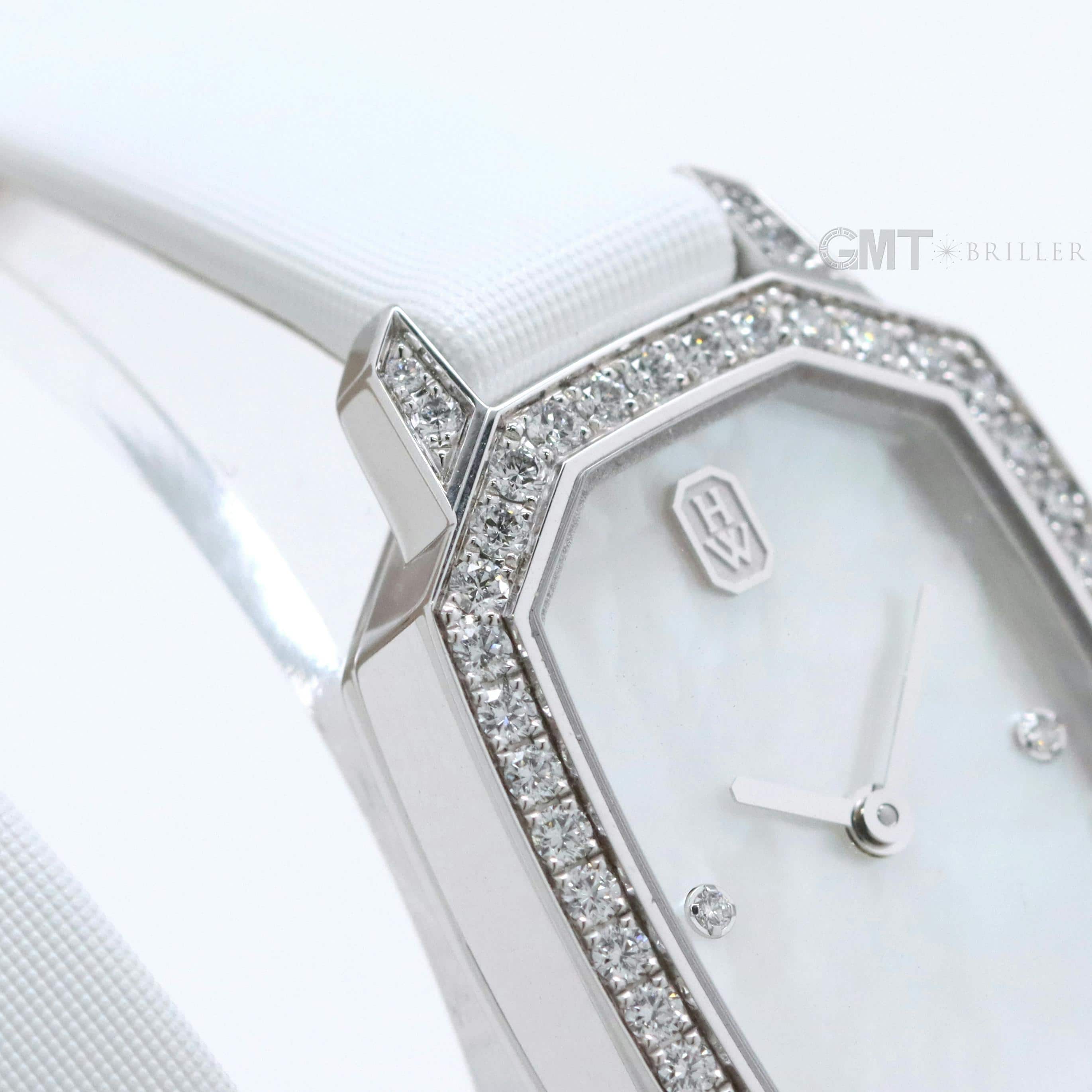 エメラルドは創始者であるハリーが最も愛したというダイヤモンドカット、 『エメラルドカット』からインスパイアされたコレクションです。 控えめなサイズながら、ホワイトゴールドケースや文字盤、尾錠にいたるまで 67個の約0.53カラットのダイヤモンドが散りばめられた非常に美麗なモデルです。 艶やかな光沢を湛えたホワイトシェルの文字盤が手元を可憐に彩る、淑女のための腕時計です。