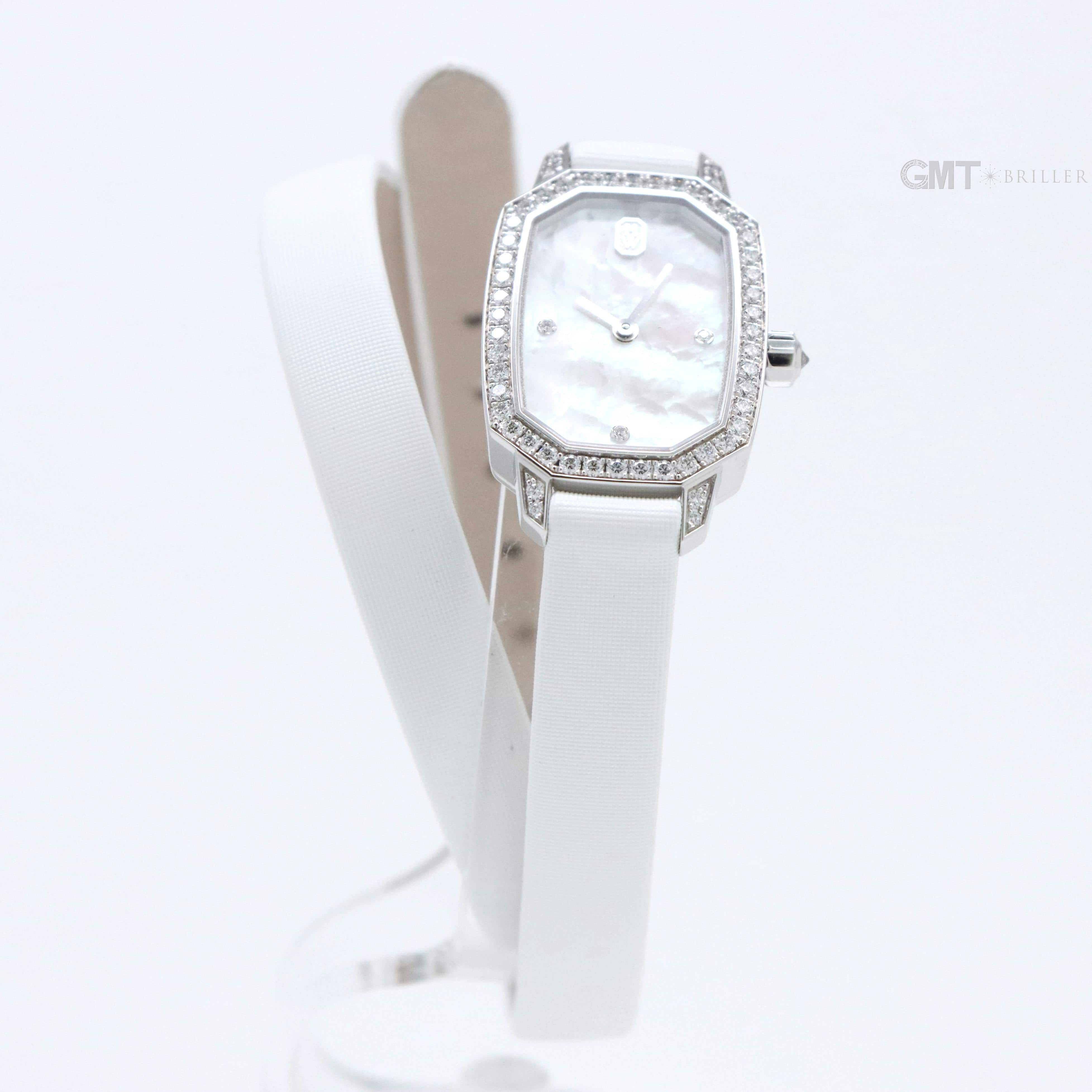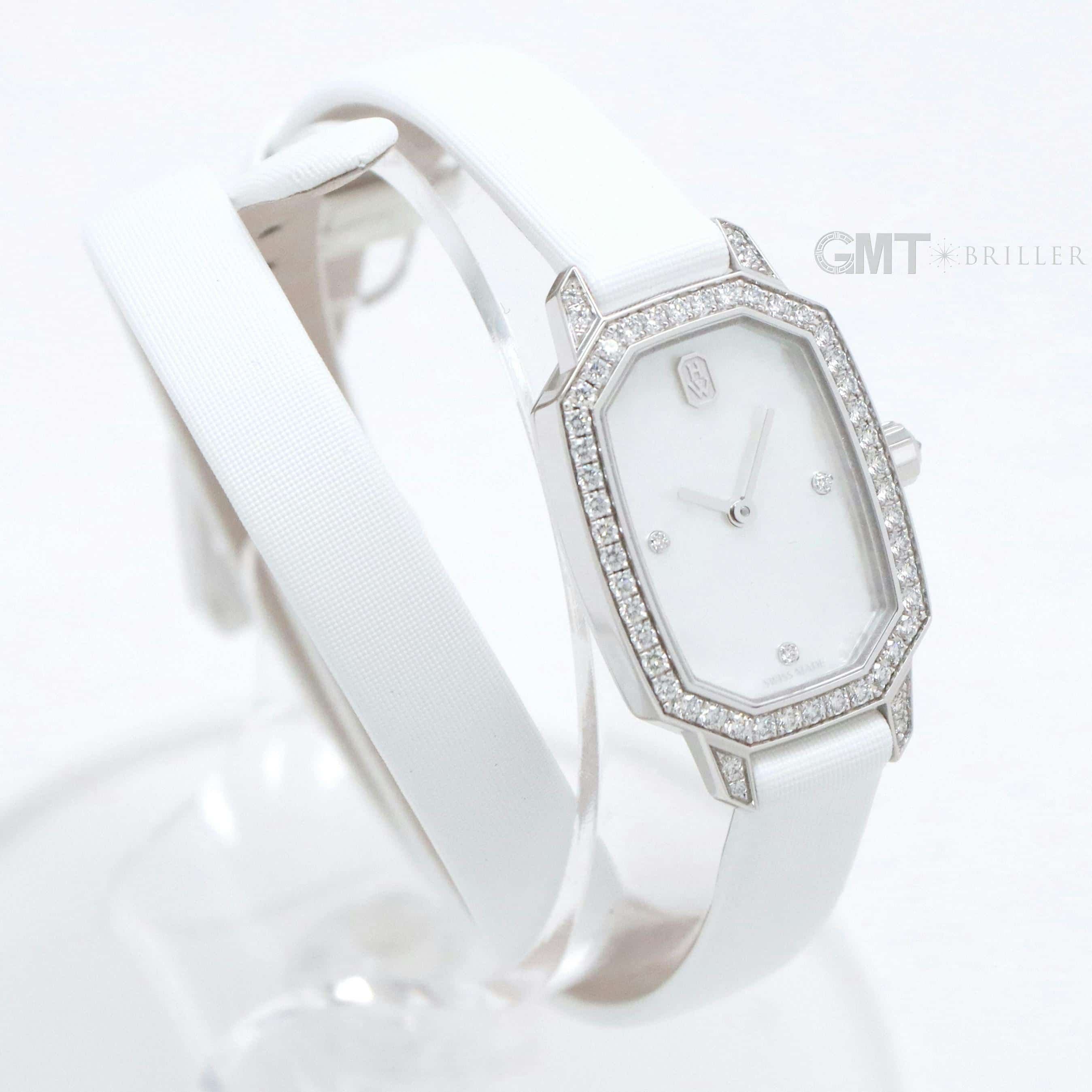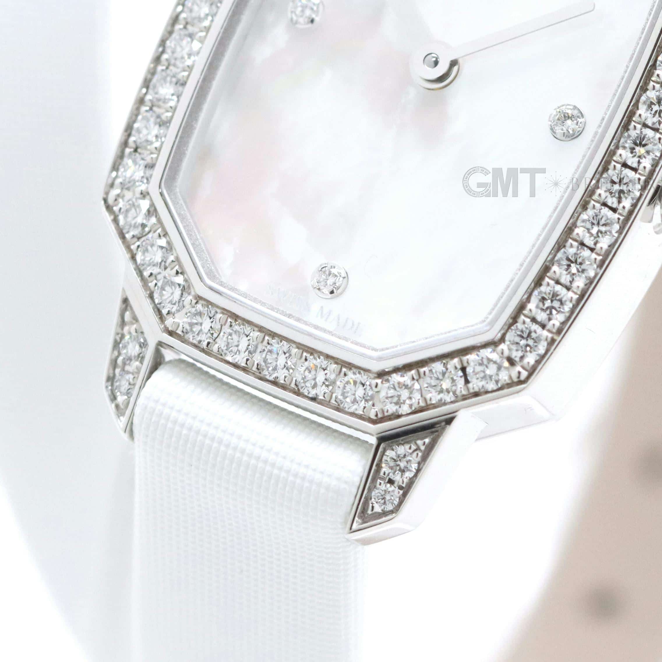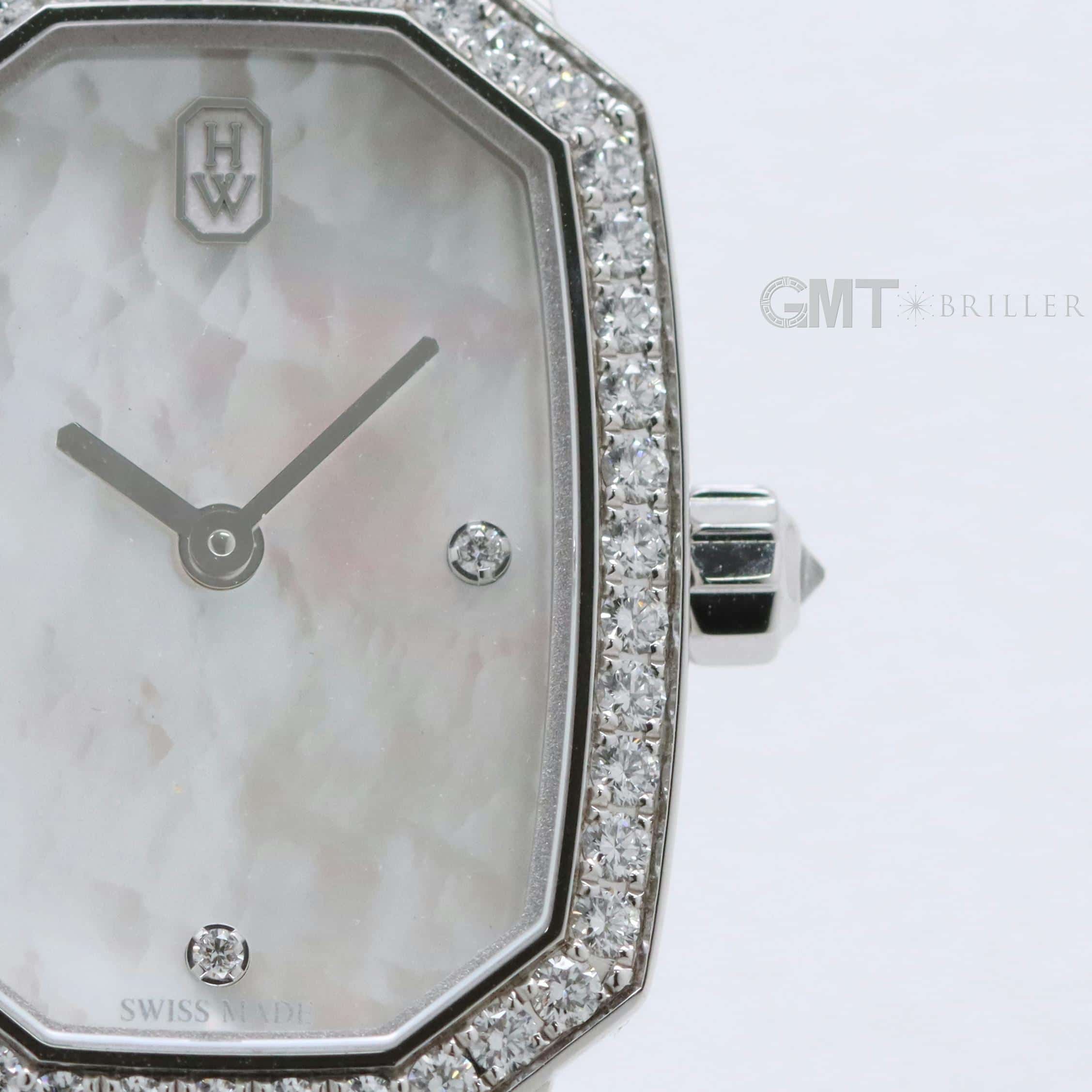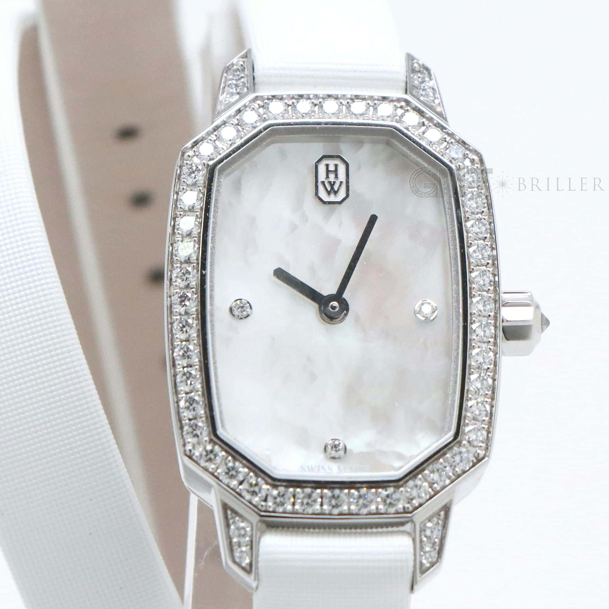 エメラルドは創始者であるハリーが最も愛したというダイヤモンドカット、 『エメラルドカット』からインスパイアされたコレクションです。 控えめなサイズながら、ホワイトゴールドケースや文字盤、尾錠にいたるまで 67個の約0.53カラットのダイヤモンドが散りばめられた非常に美麗なモデルです。 艶やかな光沢を湛えたホワイトシェルの文字盤が手元を可憐に彩る、淑女のための腕時計です。