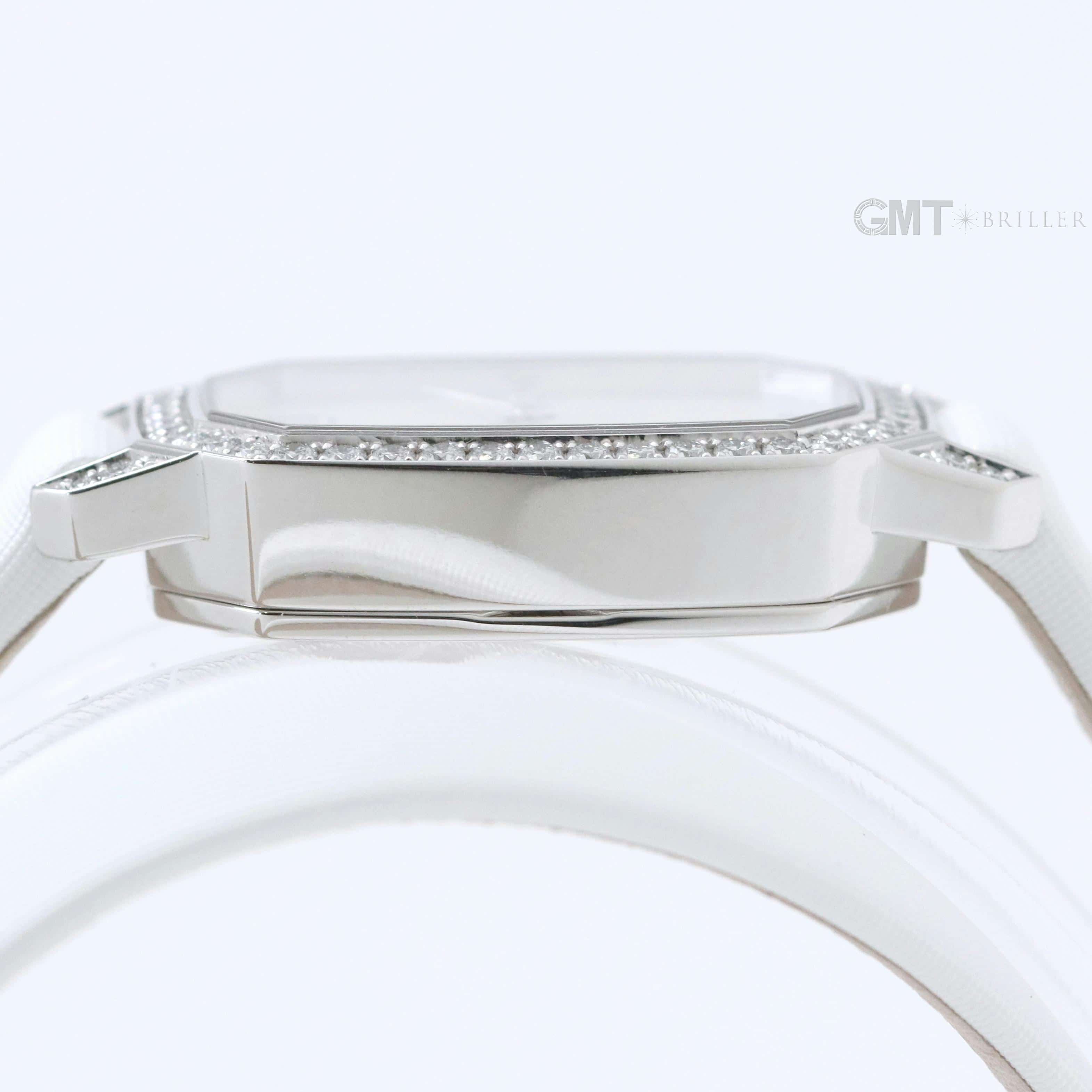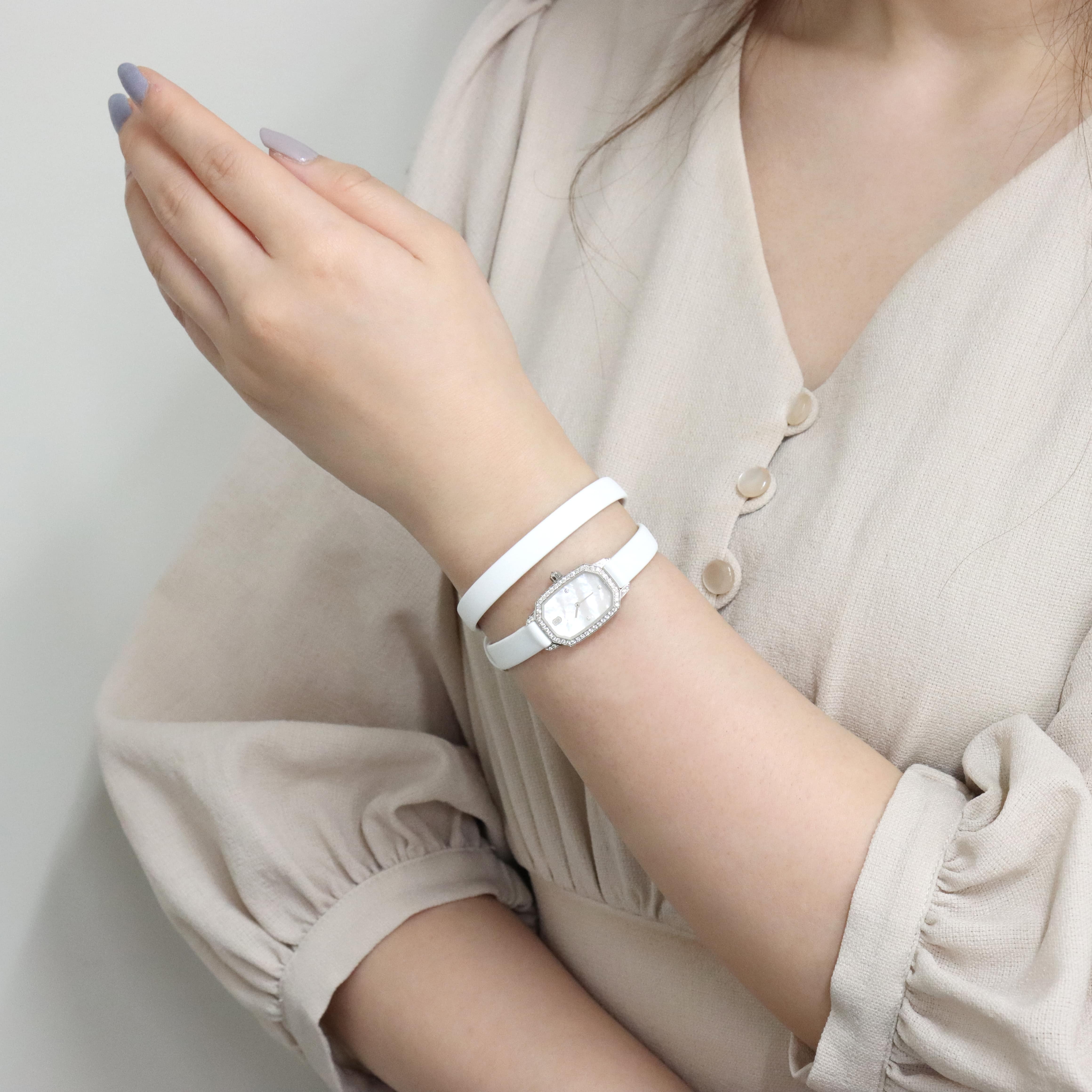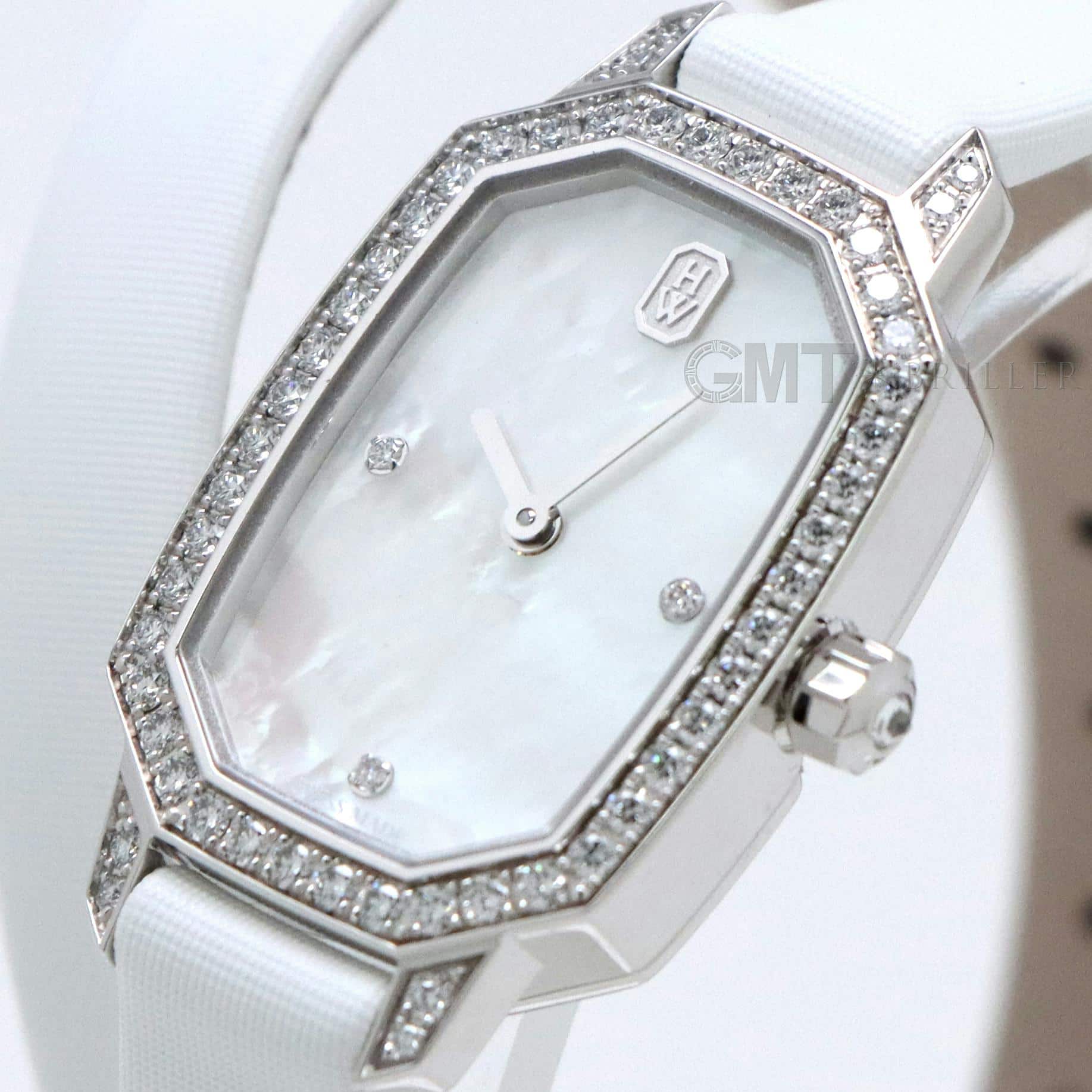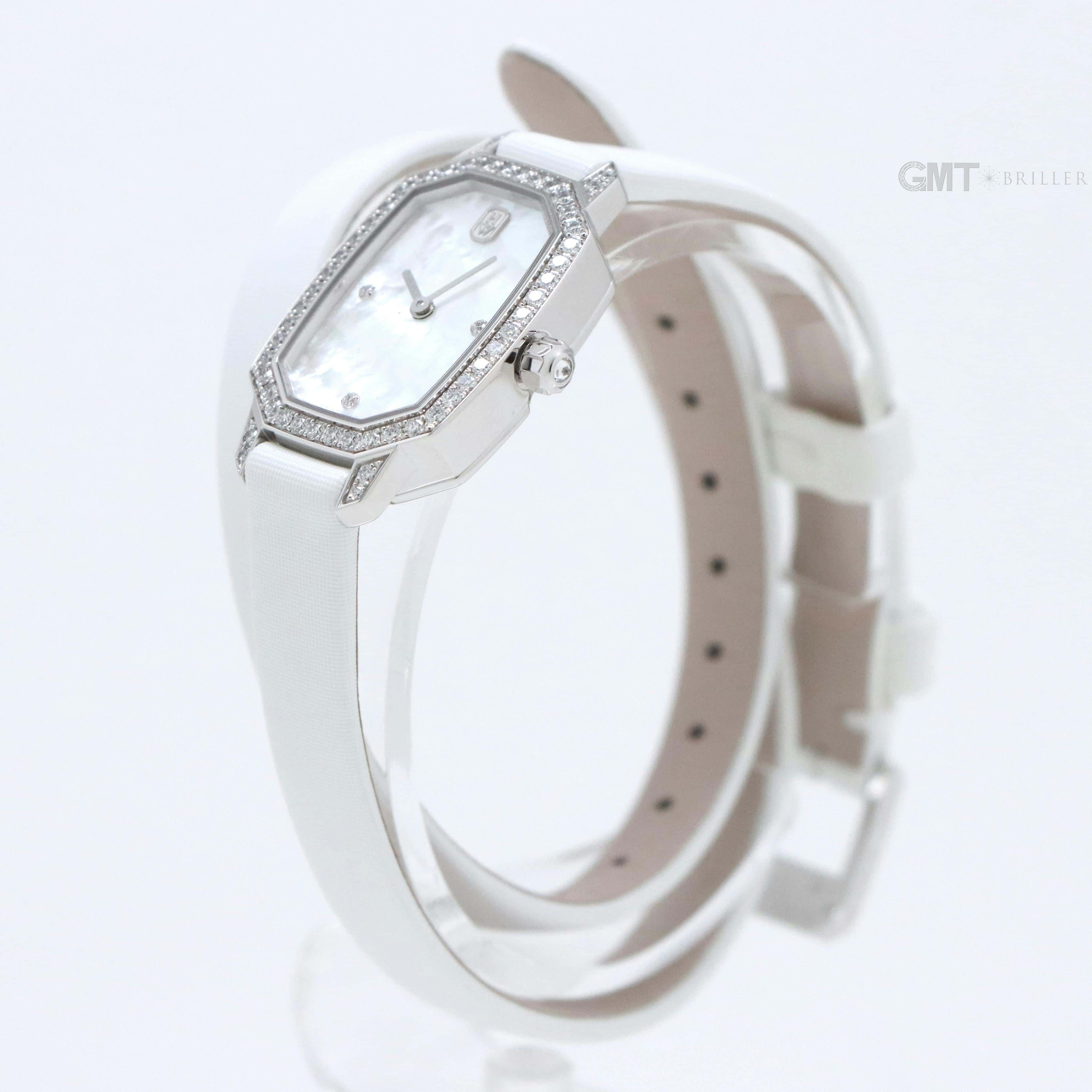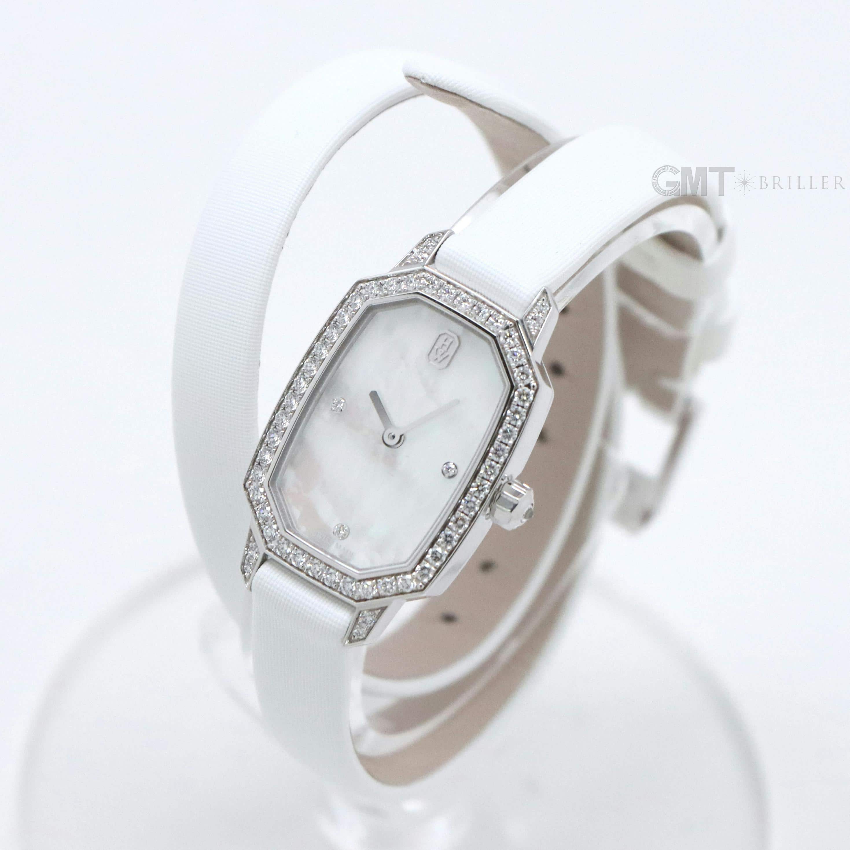 エメラルドは創始者であるハリーが最も愛したというダイヤモンドカット、 『エメラルドカット』からインスパイアされたコレクションです。 控えめなサイズながら、ホワイトゴールドケースや文字盤、尾錠にいたるまで 67個の約0.53カラットのダイヤモンドが散りばめられた非常に美麗なモデルです。 艶やかな光沢を湛えたホワイトシェルの文字盤が手元を可憐に彩る、淑女のための腕時計です。