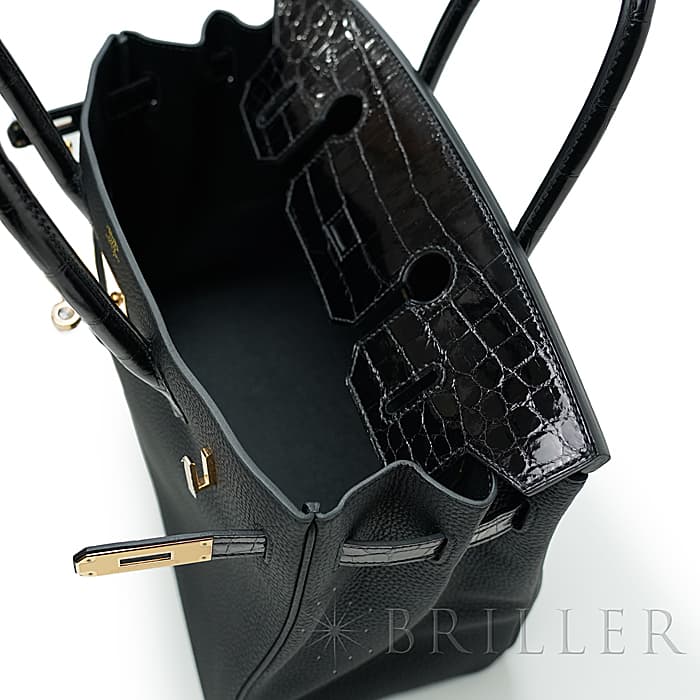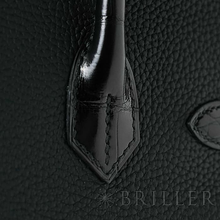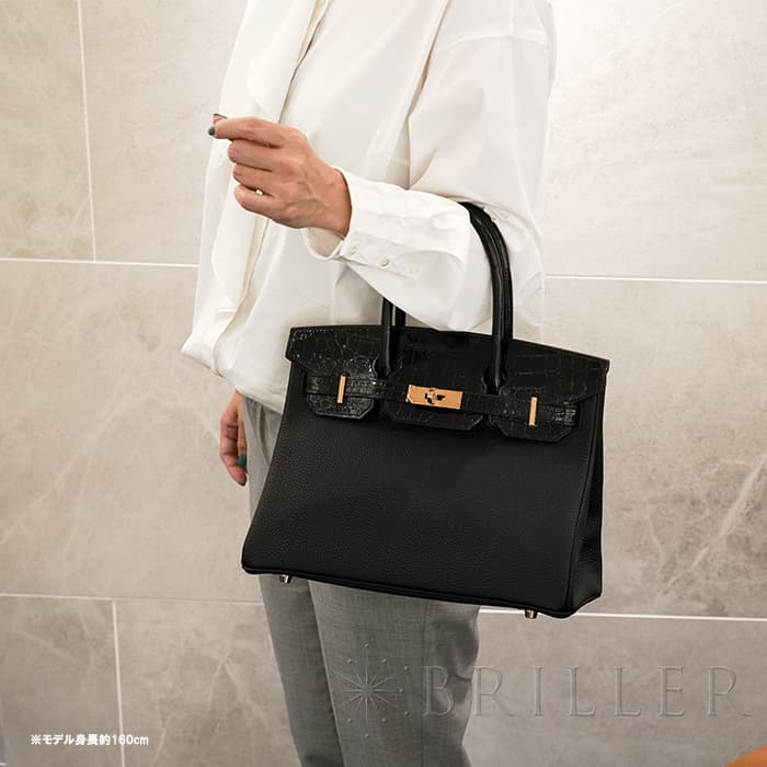 エルメス バーキンタッチ30 トゴ クロコダイル ニロティカス ブラック ピンクゴールド金具 HERMES birkin2つの素材を組み合わせた「バーキンタッチ」の中でも人気のトゴとニロティカスを使用したブラックが入荷しました。ハンドル、フラップ、ベルトやクロシェットは高級感あふれるクロコダイルを使用し、トゴの質感とのコントラストが美しい逸品です。ブラックの色合いにローズゴールドの金具がエレガントのエッセンスを加えたラグジュアリーなバッグです。プレゼントにもおすすめのドラマティックな雰囲気が魅力です。D刻印2019年のお品物です。