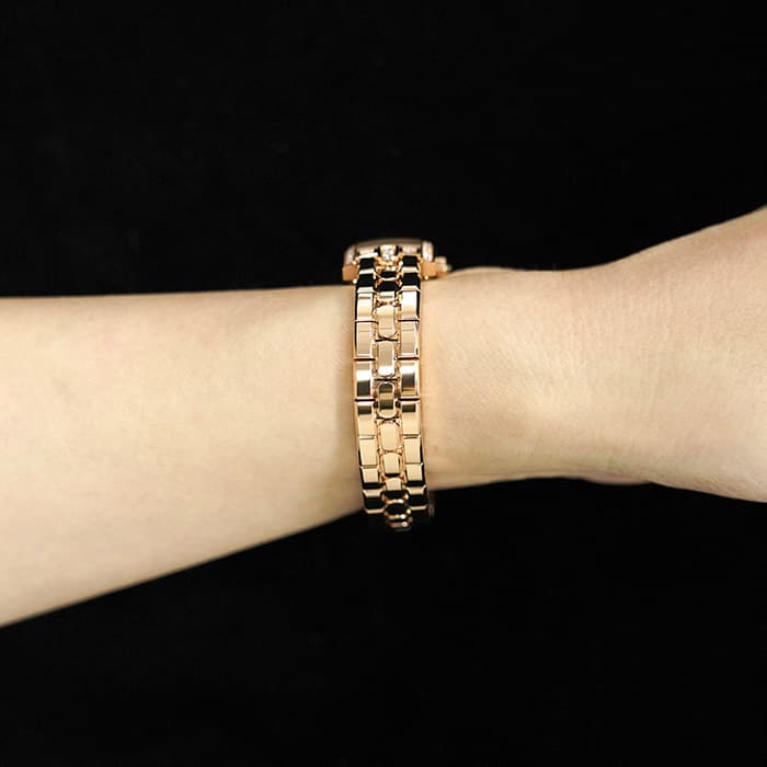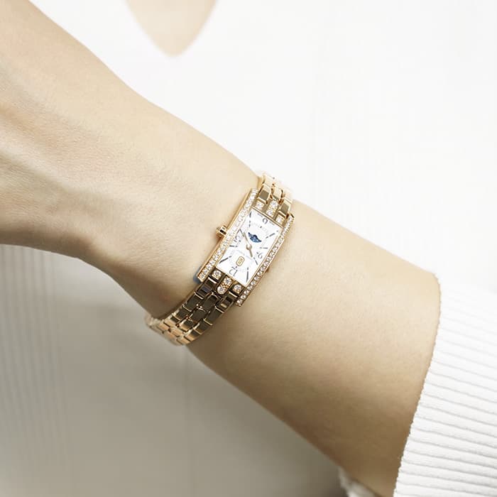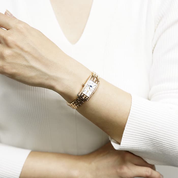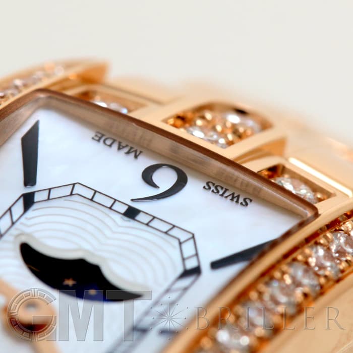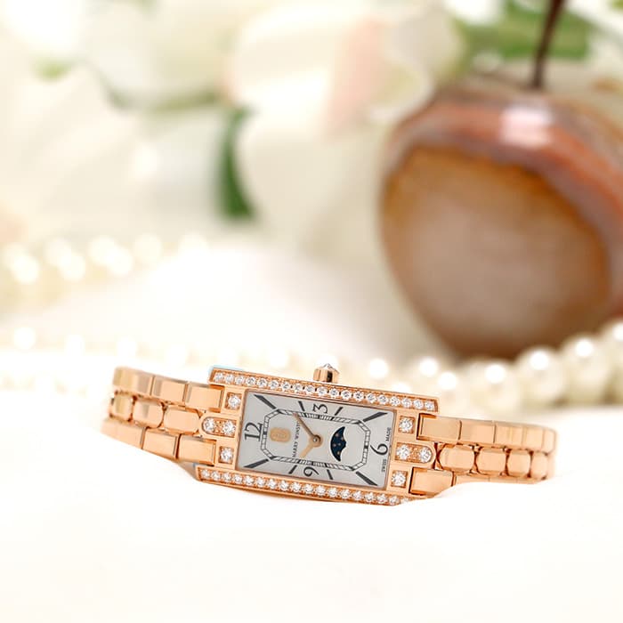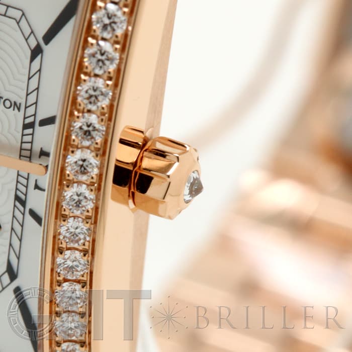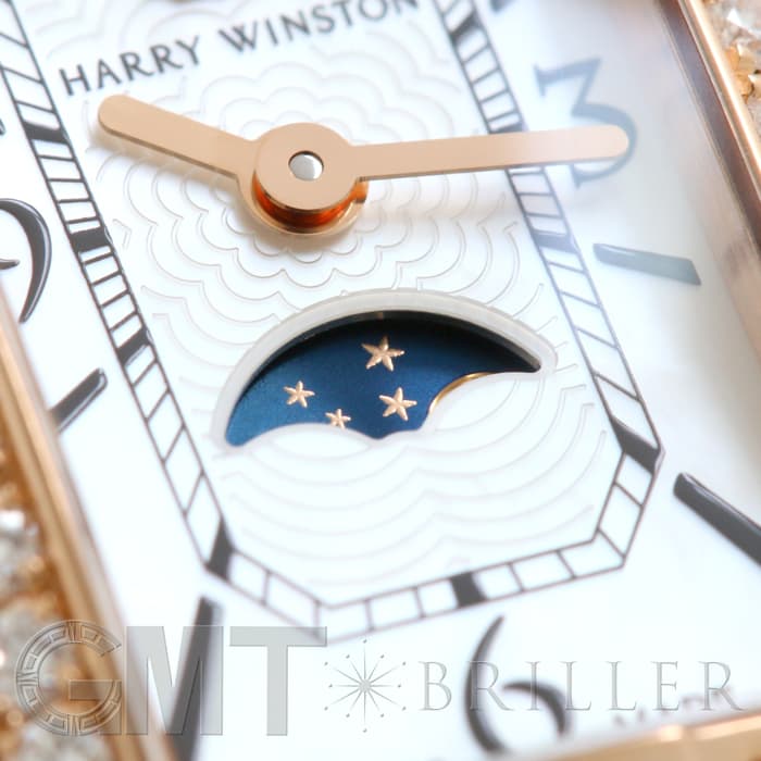 ハリー・ウィンストンが本店を構えるニューヨークのスカイラインを表現したアールデコ調のローズゴールドケースには、約0.69カラットに及ぶ47個のラウンド・ブリリアントカット・ダイヤモンドがセッティングされており、ハリーウィンストンの最上級のダイヤモンドを心ゆくまでご堪能いただけます。ホワイト マザーオブパールの文字盤には繊細なギョーシェ彫りが施され、6時位置に配されたロマンチックなムーンフェイズとも相まって、高級ジュエラーとしての魅力だけでなく、時計メーカーとしてのこだわりも感じられる非常にラグジュアリーな腕時計です。