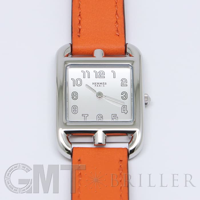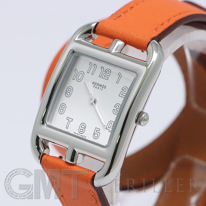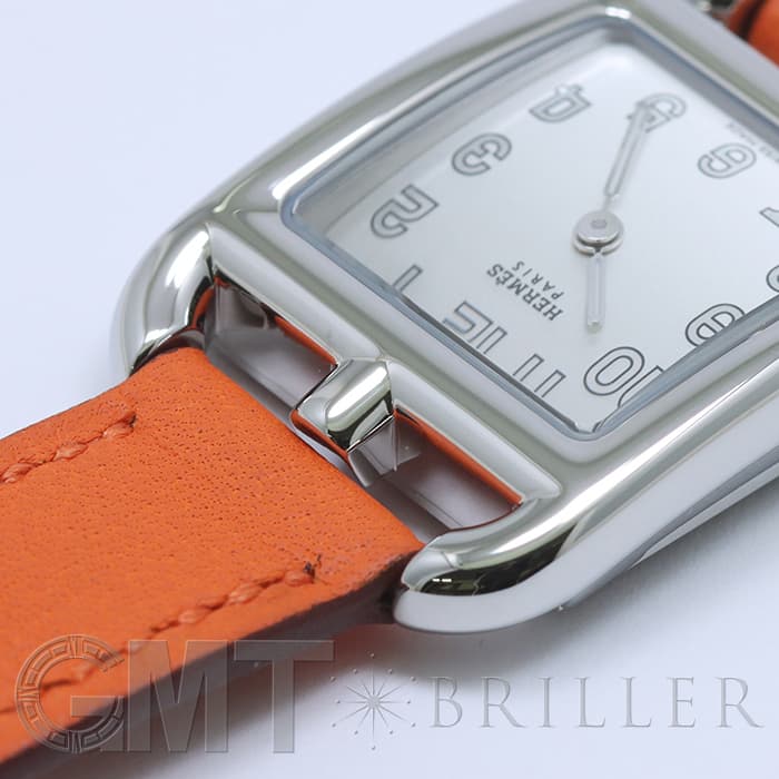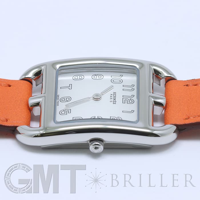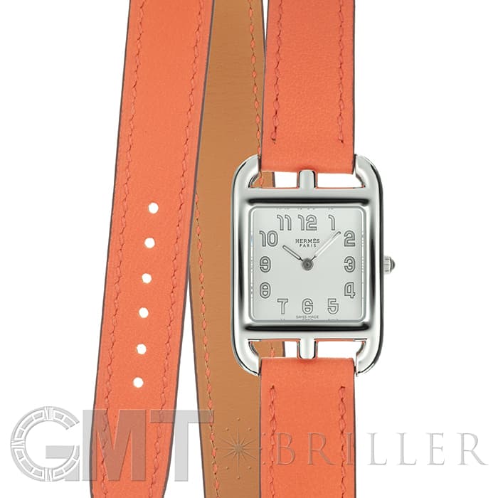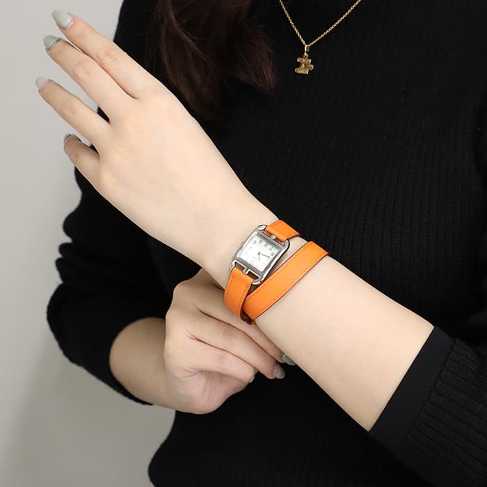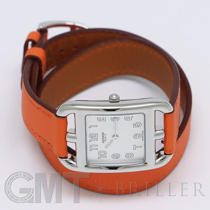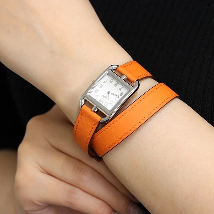 「H」型のケースに柔らかな曲線のラグが組み合わせられた「ケープコッド」は アメリカ東海岸の高級リゾート地ケープコッドをイメージして作られた時計です。 エルメスのバッグや小物などに使用される皮革素材「ヴォー(=雄仔牛)・スウィフト」を採用したドゥブルトゥール(2重巻)のストラップは、エルメスのブランドカラーでもある鮮やかなエルメスらしいオレンジで 大人の上品な魅力を醸し出しながらも生き生きとした表情をお楽しみいただけます。 様々なコーディネートに対応できるオールマイティなデザインです。
