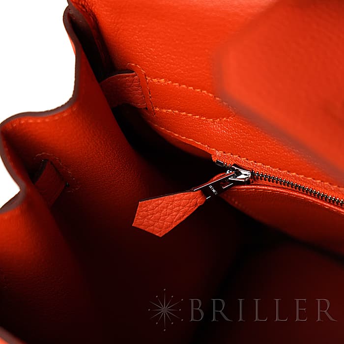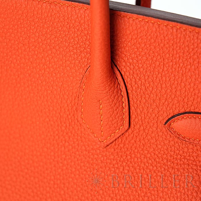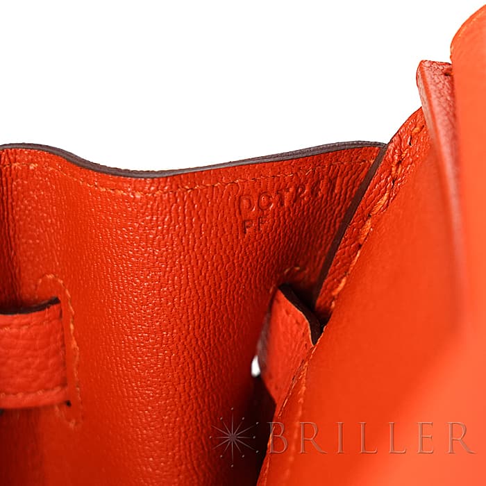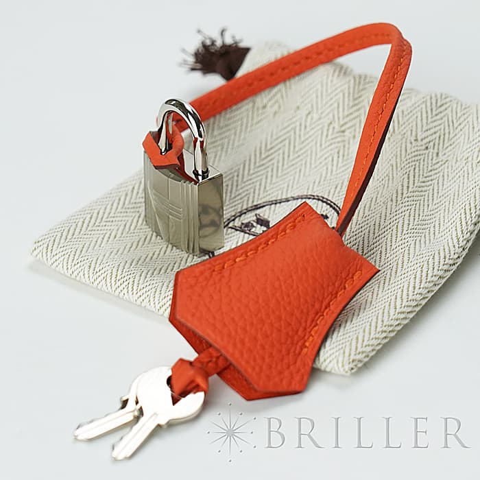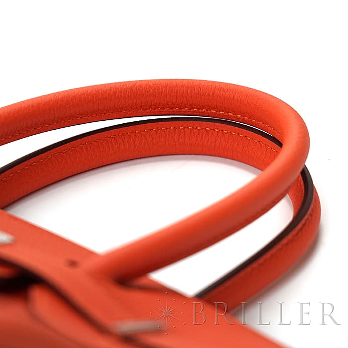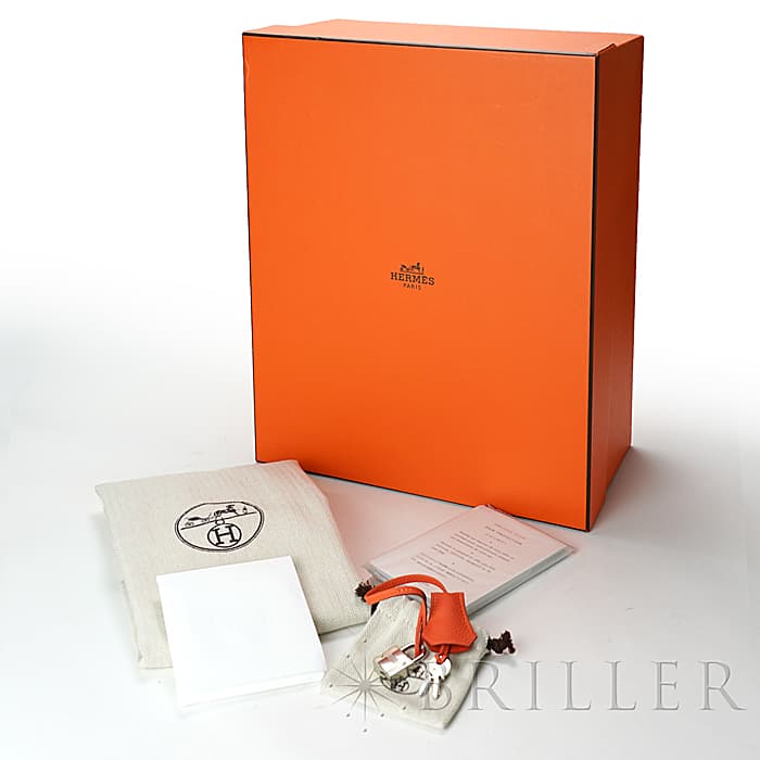 「バーキン」の由来は歌手の「ジェーン・バーキン」が航空機でエルメスの社長と出会い、物があふれかえりそうになっている彼女のバッグを見て、収納がたくさんできるバッグとして創られました。整理せず物を入れることができる秀逸な「バーキン」は全世界で愛されています。フーは明るく燃える火の色合いのように輝くような色合いが特徴的で、エルメスオレンジ色に近いですが、トゴのフーはパステルのような雰囲気も感じます。上質なデイリーに楽しむバッグとしておすすめです。刻印はD刻印2019年の新品状態のお品物です。