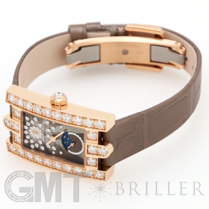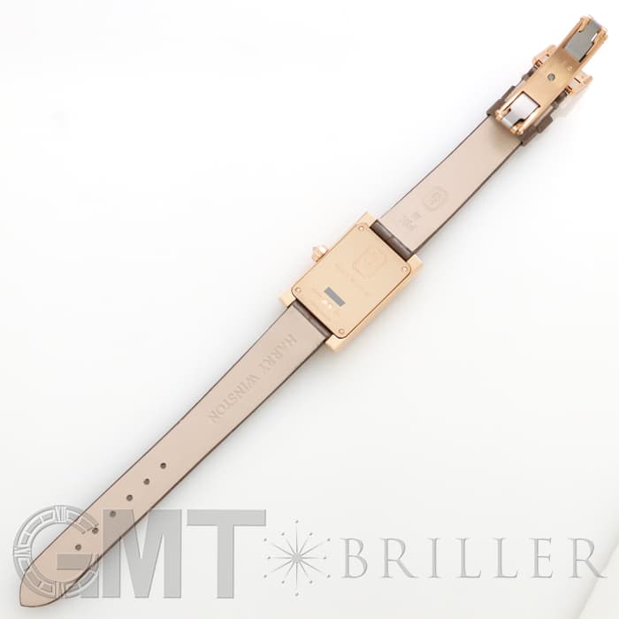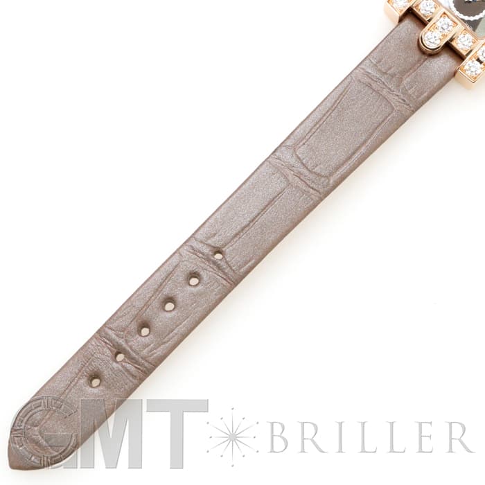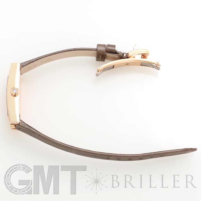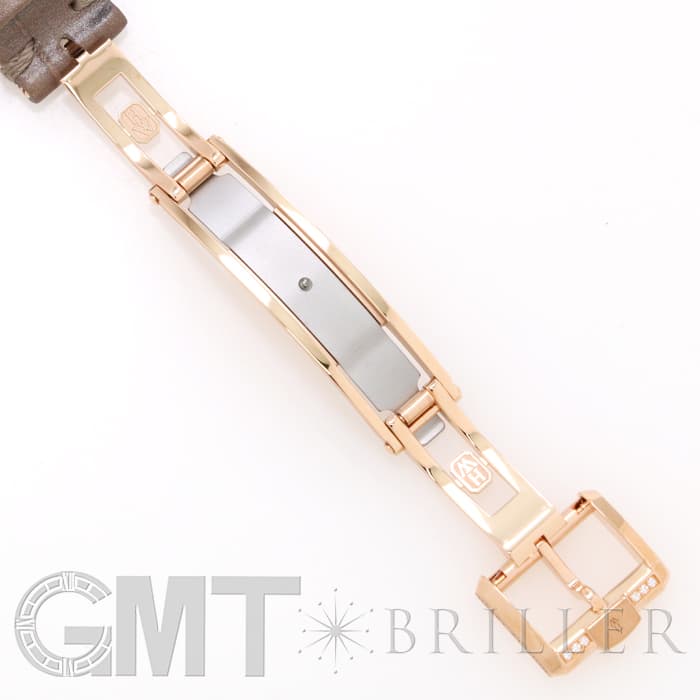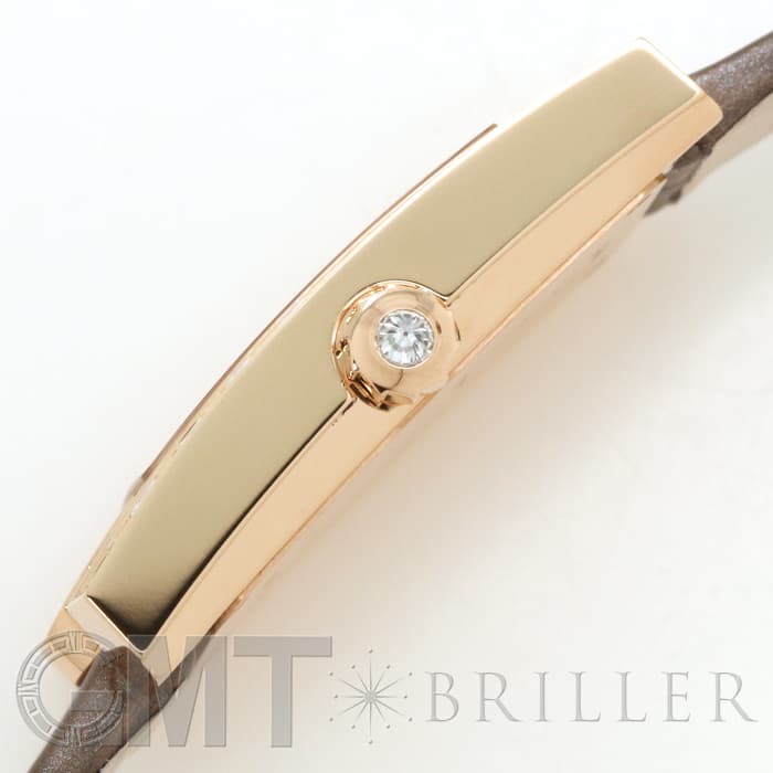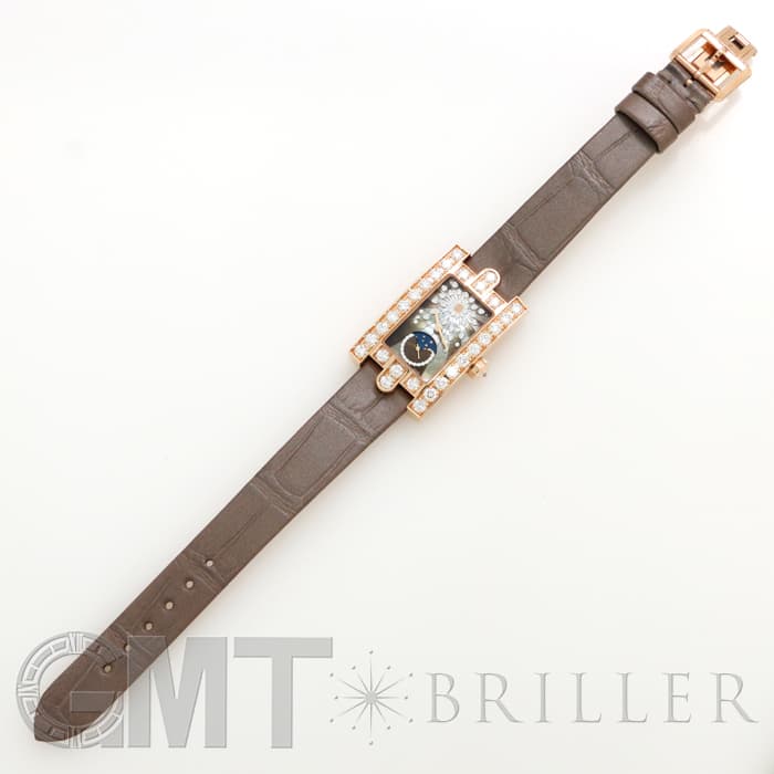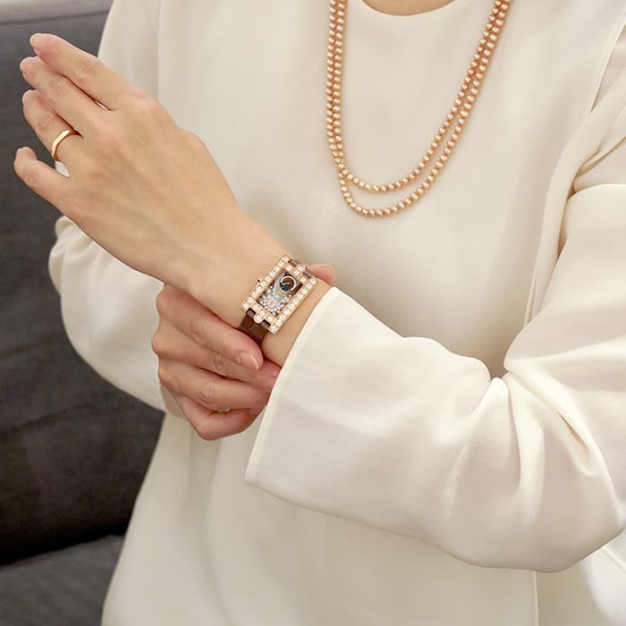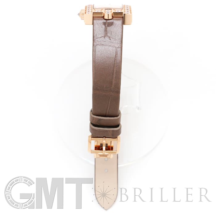 アールデコ調のピンクゴールド製レクタンギュラーケースのベゼルにセッティングされた28個の大粒のブリリアントカット・ダイヤモンドをはじめ、バックル、リューズ等にちりばめられダイヤモンドは総計約2.37カラットになります。