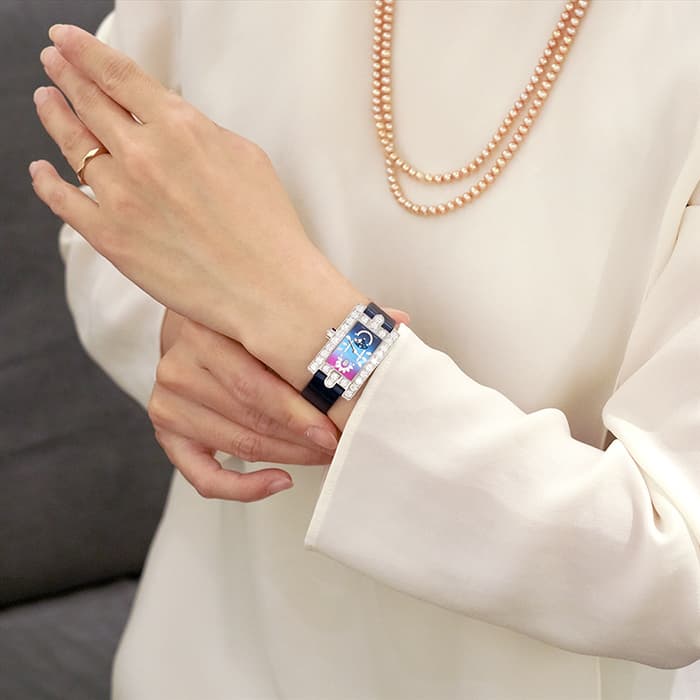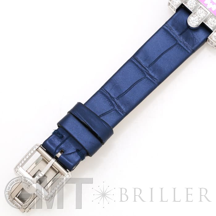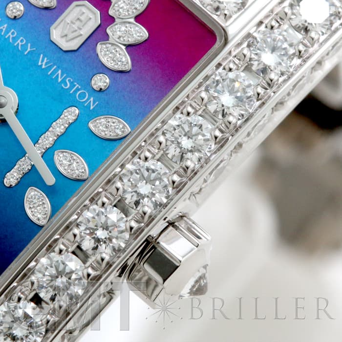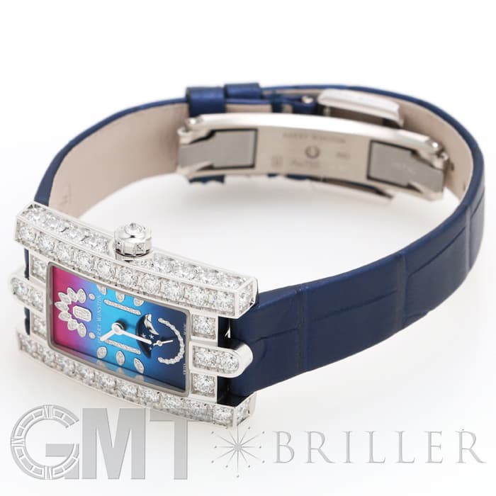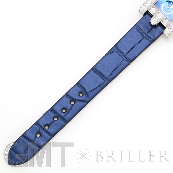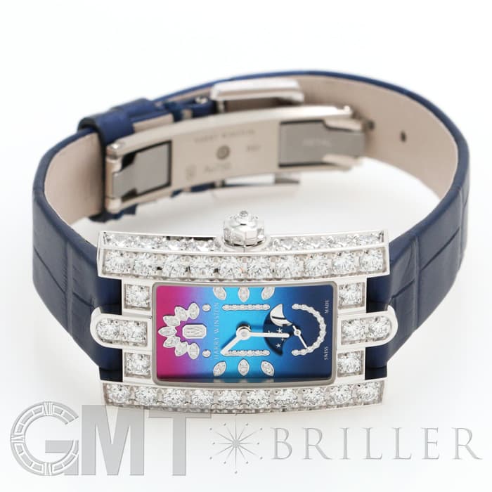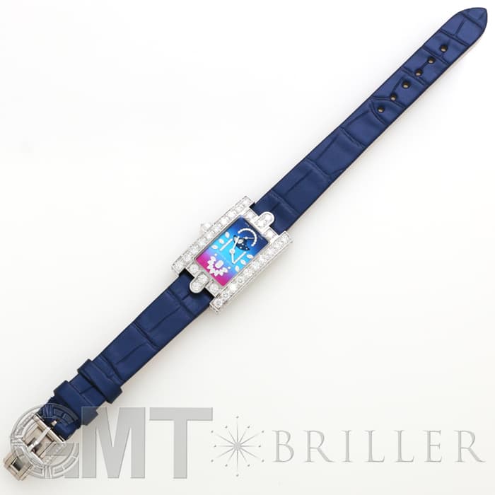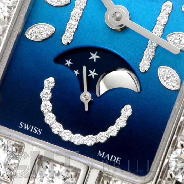 ブルーとパープルによるグラデーションのMOPダイヤルにはニューヨーク5番街本店をモチーフに52個のダイヤモンドが配されており、アールデコ調のホワイトゴールド製レクタンギュラーケースのベゼル、ケースサイドにセッティングされた48個の大粒のブリリアントカット・ダイヤモンドをはじめ、バックル、リューズ等にちりばめられダイヤモンドは総計約4.32カラットになります。6時位置には月の満ち欠けを再現する「ムーンフェイズ」表示機能を搭載し芸術的なデザインの中に機能性も持ち合わせた1本です。