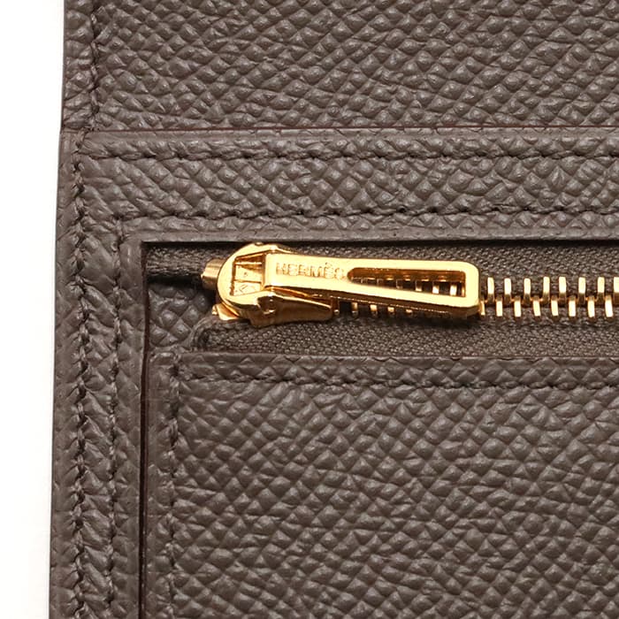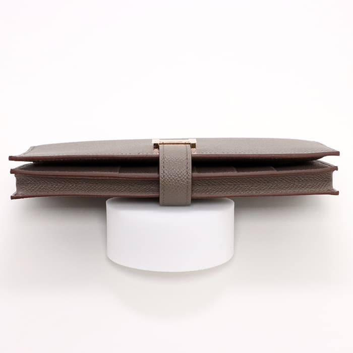 エルメス ベアンスフレ エプソン グリエタン ローズゴールド金具 HERMESフランス西部の「ベアン」が由来の「ベアンスフレ」その特徴はエルメスの代表的なデザイン「Hマーク」の留め具。札入れ部分はマチ付きタイプとなり紙幣、チケットなどの収納に便利です。実用性の高さと上品さを兼ねそろえたラグジュアリーウォレットとなっております。スモールレザーグッズの中でもエルメスの代名詞といえるベアンシリーズです。フランス語で「錫」という意味のシルバートーンのグレーがおしゃれで、ローズゴールド金具が甘さを+しています。Z刻印(2021年)のお品物です。