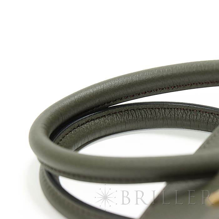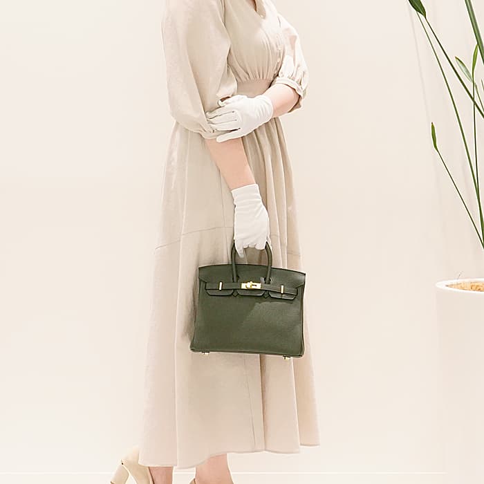 「バーキン」の由来は女優の「ジェーン・バーキン」が航空機でエルメスの社長と出会い、物があふれかえりそうになっている彼女のバッグを見て、収納がたくさんできるバッグとして創られました。整理せず物を入れることができる秀逸な「バーキン」は全世界で愛されています。ハンドバックとしても使いやすく年齢問わずに人気のサイズ「バーキン 25」です。エルメスだからこそ作り上げられた上品なカラー「ヴェールグリス」は、グリーングレーとも言える見る角度や風合いによってその奥に潜む深い色合いを楽しめます。ハンドルが短いので腕にかけることができませんが、その分エレガントでいてラグジュアリーな雰囲気です。硬すぎず柔らかすぎずで印象に優しささえプラスする「トゴ」との組み合わせで、さらに上品さに磨きがかかった大人の女性のためのデイリーユースができるバーキンです。ゴールド金具の組み合わせで華やかに、女性らしさを格上げしてくれそうなこちらのバーキンは、Z刻印(2021年)の新品です。