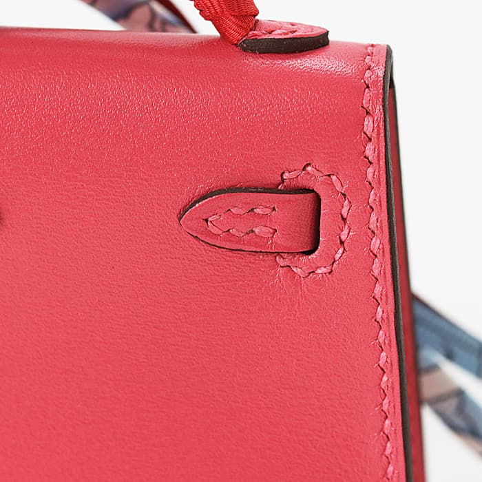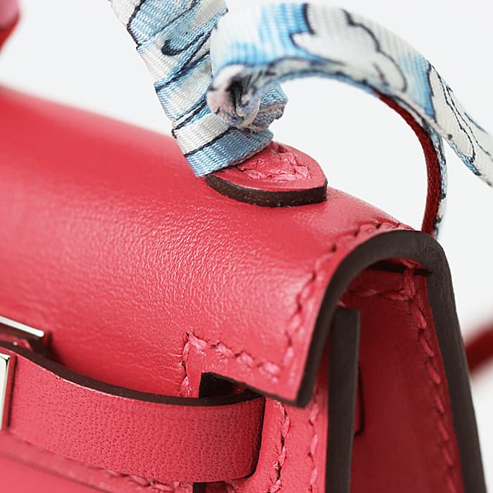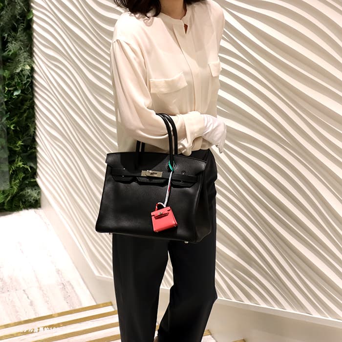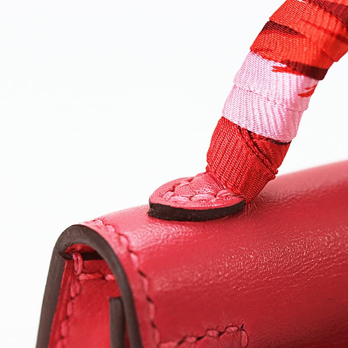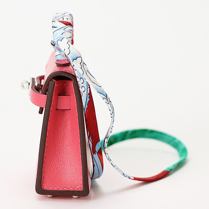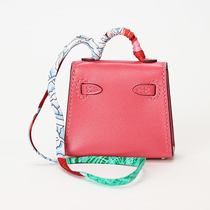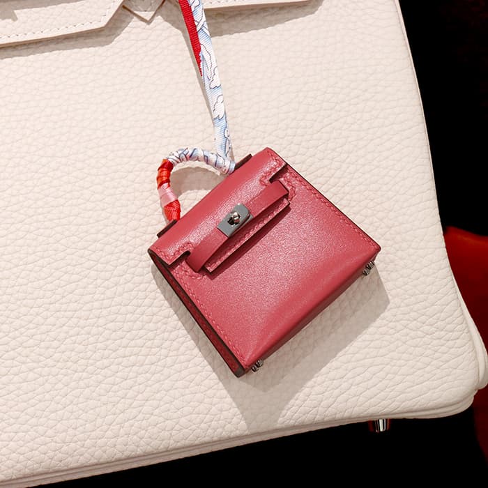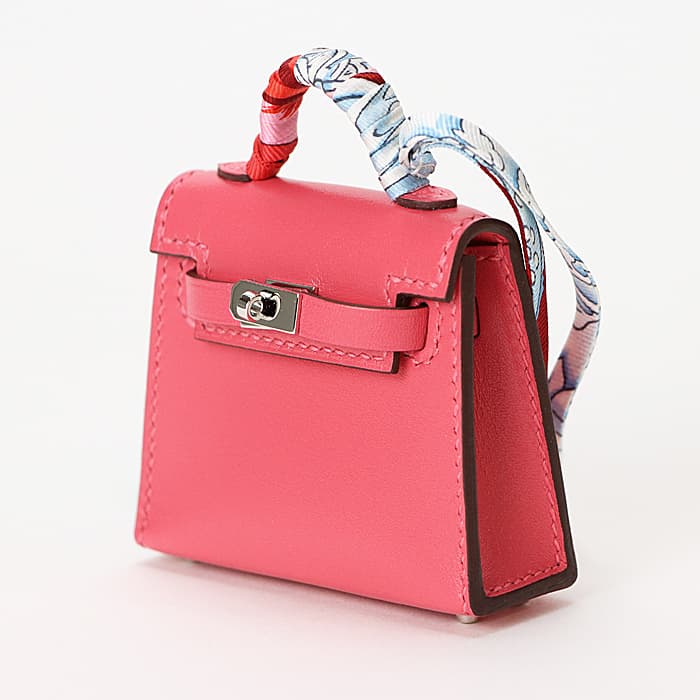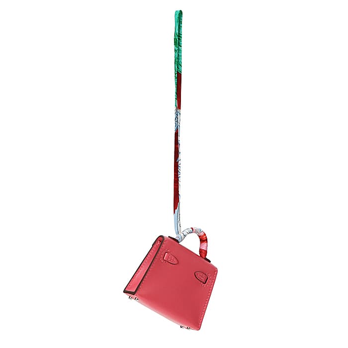 エルメスのアイコニックなバッグ「ケリー」がチャームになりました。とっても小さくて可愛らしいケリーバッグはフラップを開けることもでき、とても精巧に作られています。ローズリップスティックの色合いが華やかさを、シルクで作られたストラップが高級感とおしゃれのエッセンスを感じさせます。ケリーやバーキンの素材や色に合わせてコーディネートするとこなれ感たっぷりのリッチな雰囲気が楽しめます。