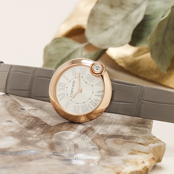 ピンクゴールドのケース素材と1粒のダイヤモンド、セミマットライトグレーのアリゲーターの高級感ある革ベルトの組み合わせで、 控えめでありながら上質感を味わうことのできる大人のためのレディース腕時計です。