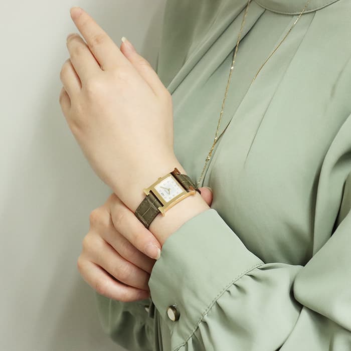 1996年の誕生以来、ブランドの頭文字「H」をモチーフにした「Hウォッチ」は、エルメス時計の中でも人気を集め続けるアイコンウォッチです。 特徴的な「H」型のケースに、シンプルな文字盤に、世界が認めるエルメスの革職人によって製作される、最上級のレザーストラップは、豊富なカラー展開で簡単に付け替えることができ、さまざまなシーンに、豊かな表情で楽しませてくれます。 華やかなピンクゴールドプレーテッドケースに、天然素材のホワイトシェルダイヤル、ダイヤモンドで華やかさをプラスし、上品な大人の雰囲気のグレーエレファントレザーストラップがデザインを引き締めます。 さりげなく身に着けられる上質な時間を、ぜひ体験してください。