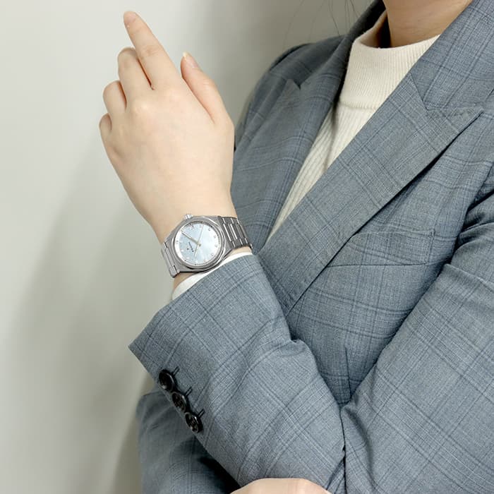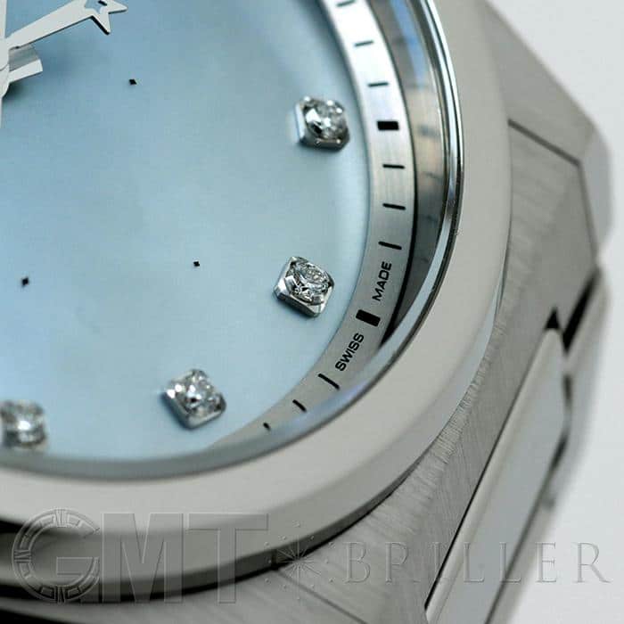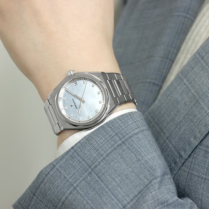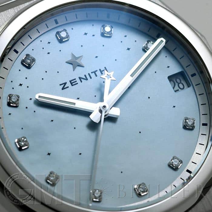 ゼニスは歴史に残る傑作と言われるムーブメント「エル・プリメロ」を開発した名門ブランド。デファイはゼニスが「THE FUTURE OF TRADITION(伝統の未来)」をテーマに開発し、ムーブメントやデザイン、素材などこれまでのブランドに無い画期的なモデルが色々展開されているコレクションです。デファイ ミッドナイトは女性向けのスポーティシックなタイムピース。天然素材のホワイトシェルに淡いブルーのグラデーションを重ね、夜空に浮かぶ月明かりが表現されています。36mmのケースサイズはスポーティな印象で、デニムスタイルやメンズライクなコーディネートに合わせやすく、また付属している3本の替えベルト(ホワイト・ブラック・バーガンディー)に付け替えることで、よりファッションの幅が広がります。インデックスの10ポイントのダイヤモンドが腕元をキラキラと輝かせます。