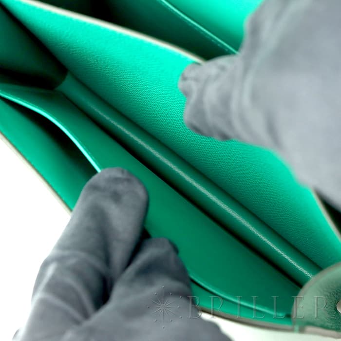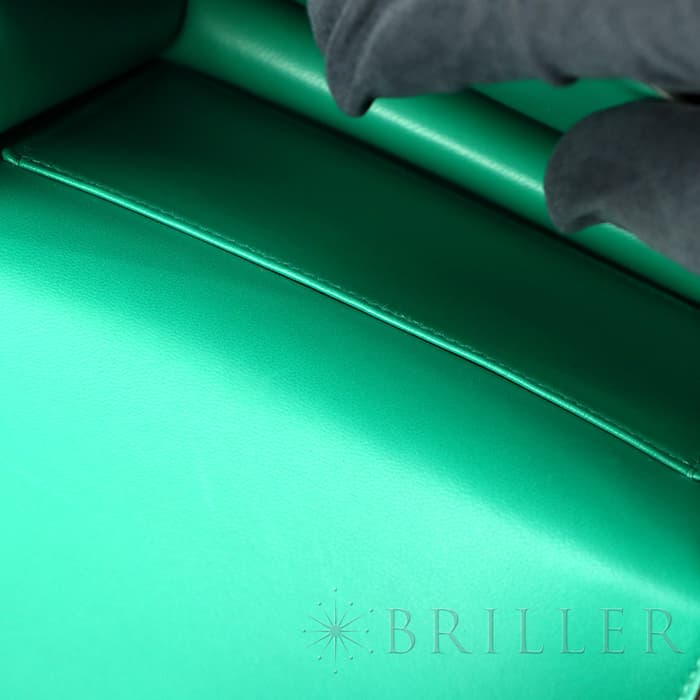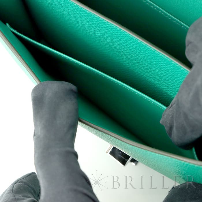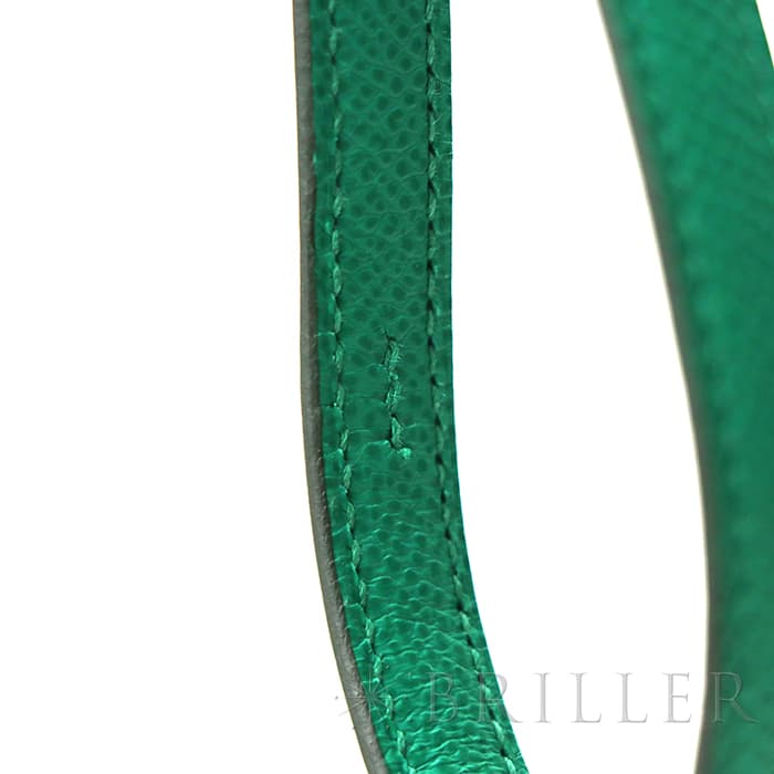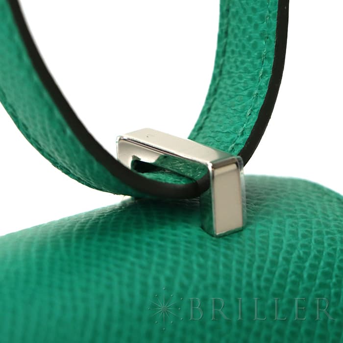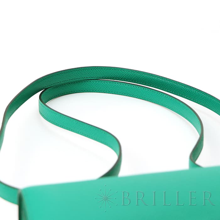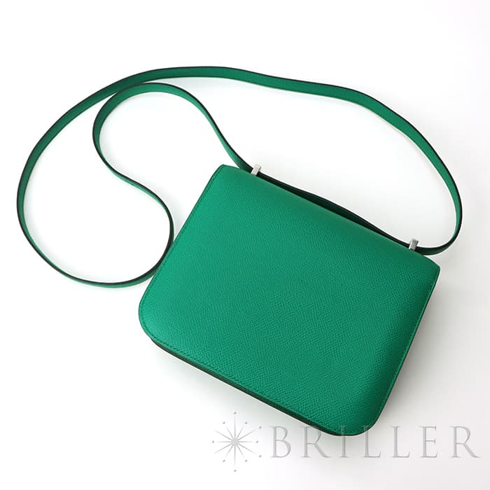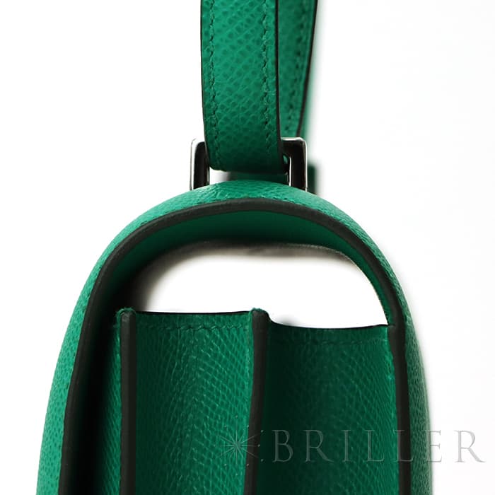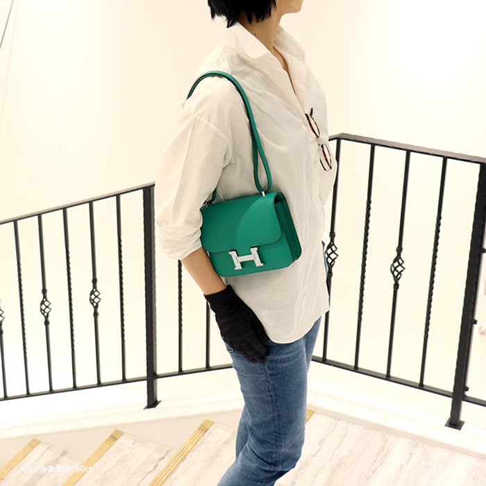 2021年春夏の新色 ヴェールジェイドは翡翠を意味し、とても色鮮やかなグリーンとラッカー仕上げのH字の金具がおしゃれなコンスタンス3のミニは、中に仕切りのついた小ぶりのコロンとした丸みがかわいらしいバッグです。商品のエプソン素材は型崩れしにくく、比較的傷もつきにくいのでデイリーに使いやすいと思います。 ショルダーを1連にして斜め掛けにもできるサイズ感で、エレガントに使いたい時は2連にして小脇に抱えればドレスアップしたスタイルにもマッチするのでおすすめです。