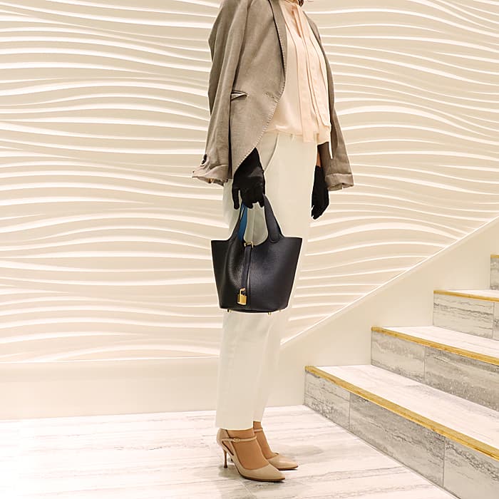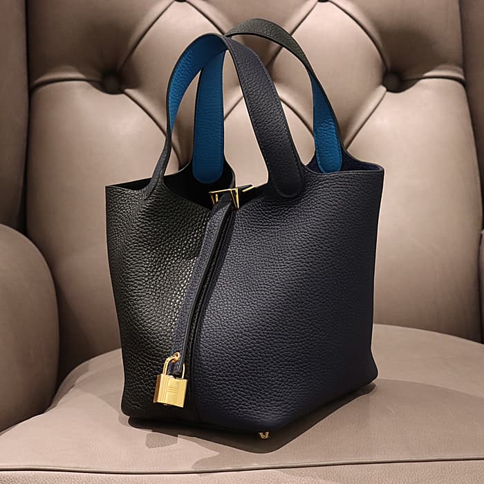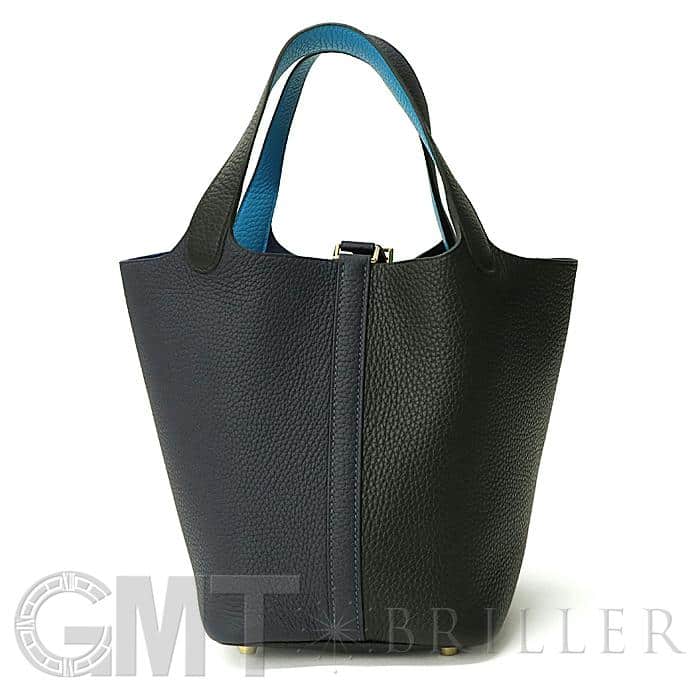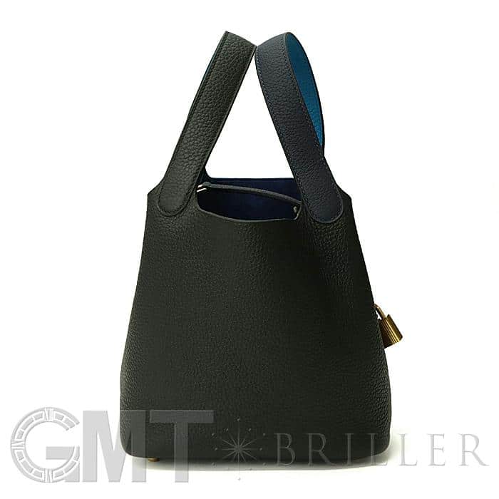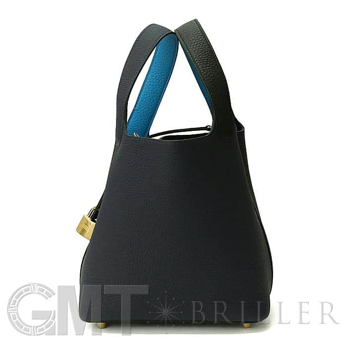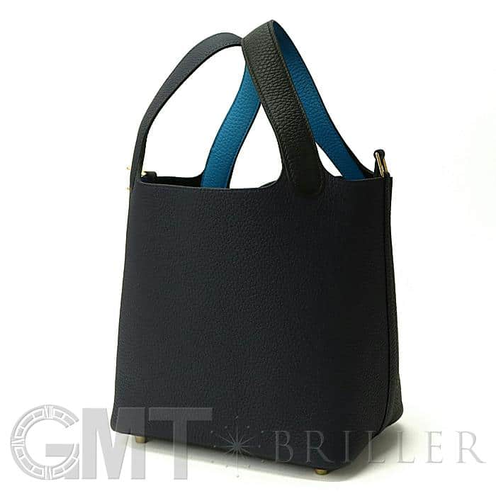 2003年発表の「ピコタン」。元々は荷物を運ぶ牛馬用の飼料を入れる袋からイメージされたバッグです。“ピコタン”とは木で作られたボワソーという穀物の量を測る入れ物で重さを計測する「単位」のことです。2008年頃からカデナの付いた「ピコタンロック」にモデルチェンジされ、この商品は人気のPMサイズで一番小さいので、ミニマムな物を持ってお買い物へ出かける時にぴったりです。3色使いで、ハンドルの内側に使われたビビッドブルーがアクセントになったおしゃれなピコタンです。Y刻印(2020年)のお品物です。