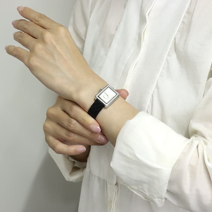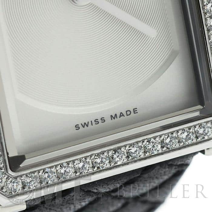 直線的なシンプルな形と、ケースを囲うダイヤモンドとオパールホワイトダイヤルは、フェミニンとマスキュリンがバランスよく混ざり合っています。