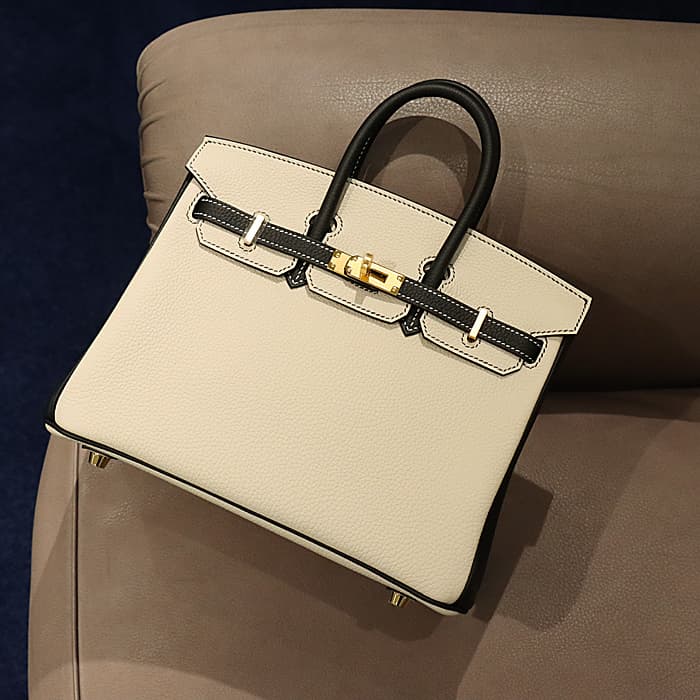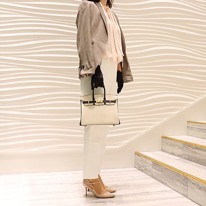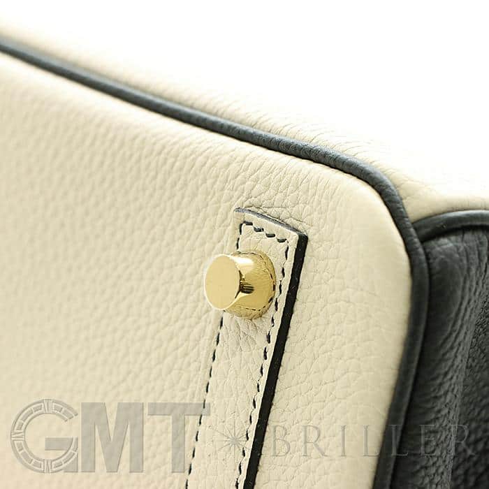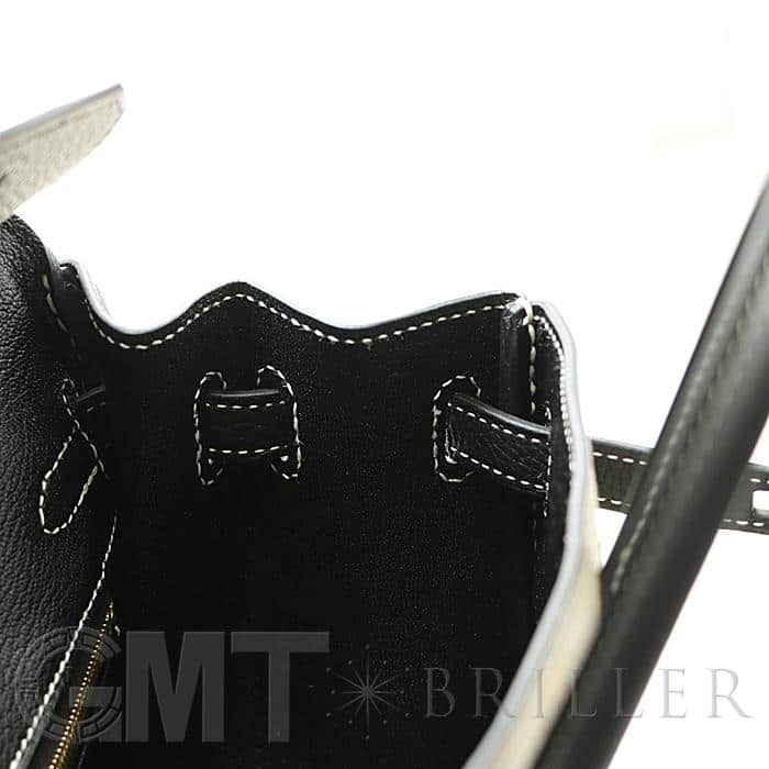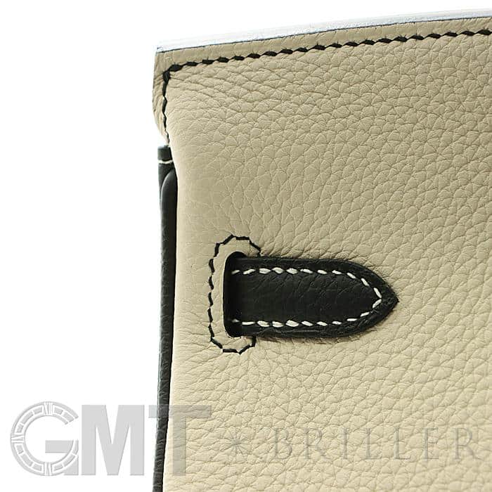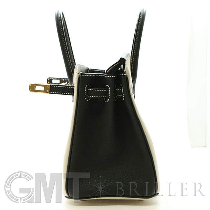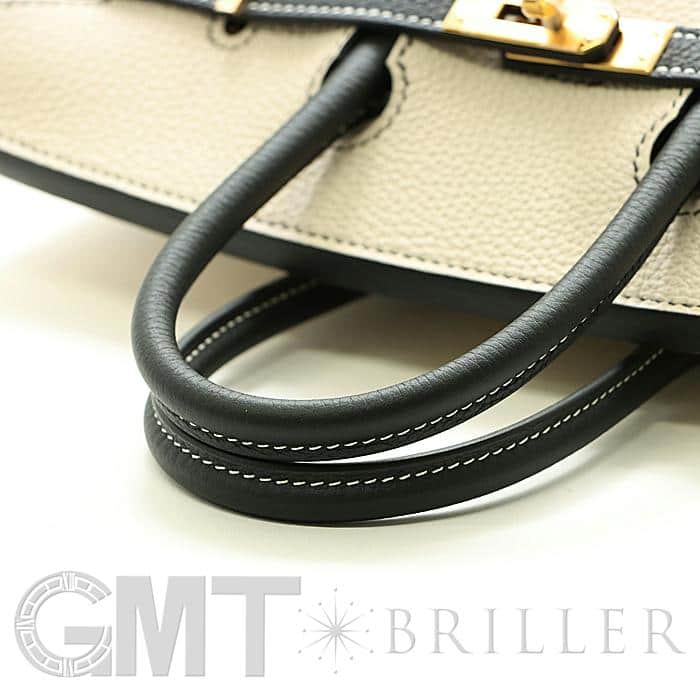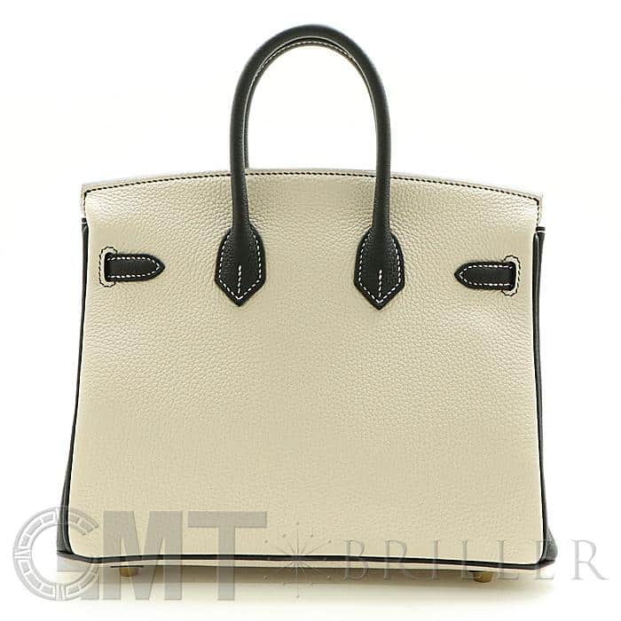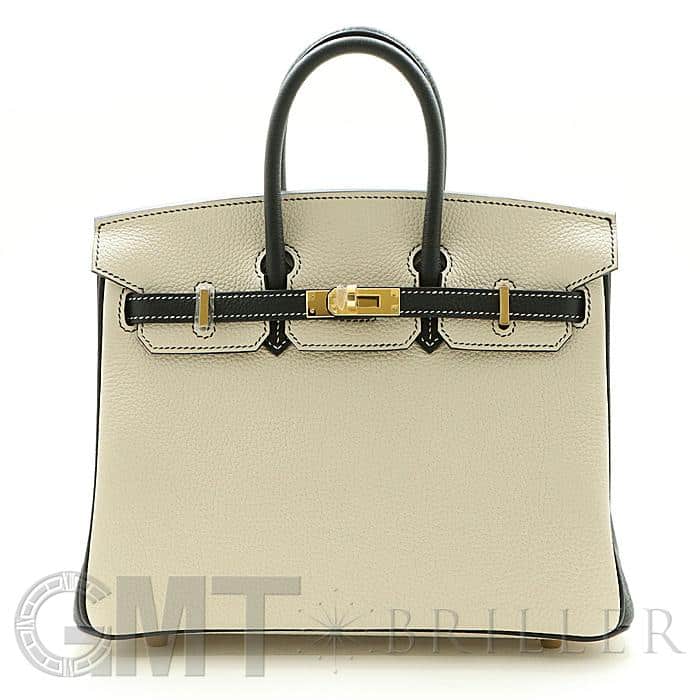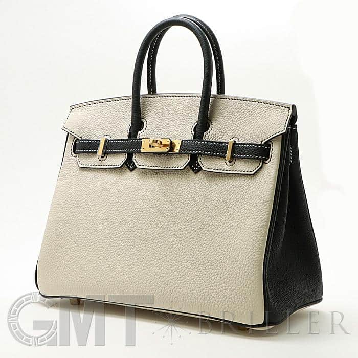 「バーキン」の由来は女優の「ジェーン・バーキン」が航空機でエルメスの社長と出会い、物があふれかえりそうになっている彼女のバッグを見て、収納がたくさんできるバッグとして創られました。整理せず物を入れることができる秀逸な「バーキン」は全世界で愛されています。25サイズのバーキンは日本人がバランスよく持ちやすいため高い人気を誇ります。このパーソナルオーダーのバイカラーがおしゃれなバーキンは、白亜のクレとブラックの上品な組み合わせをゴールド金具がドラマティックにまとめあげ、格別のインパクトで装いを華やかに彩る希少な一生物の逸品です。Y刻印(2020年)のお品物です。
