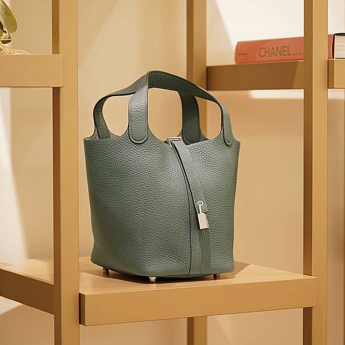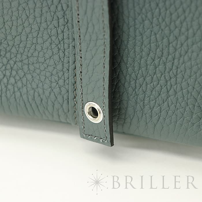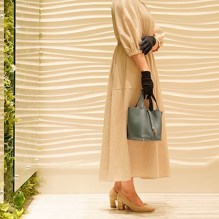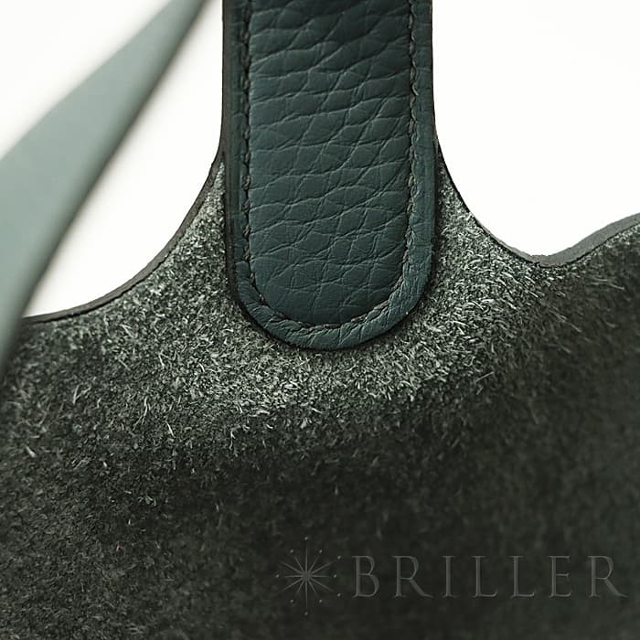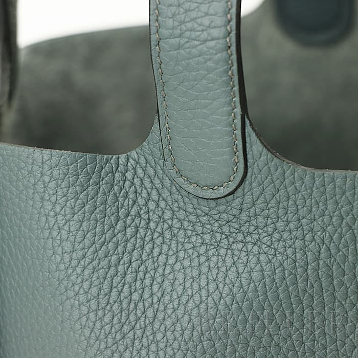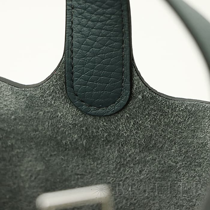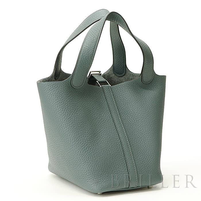 2003年発表の「ピコタン」元々は荷物を運ぶ牛馬用の飼料を入れる袋からイメージされたバッグです。“ピコタン”とは木で作られたボワソーという穀物の量を測る入れ物で重さを計測する「単位」のことです。小さめのポーチや二つ折り財布などがまとめて収納できます。2013年に登場したフランス語で“嵐”を意味する「オラージュ」、ブルーとグレーの中間色です。色の魔術師と称されるエルメスならではの絶妙なニュアンスカラーが表現されています。グレーがかった色でコーディネートへの合わせやすさもあり、こなれた大人のお洒落が楽しめるので、デイリーに愛用したくなるアイテムに仕上がっています。Z刻印(2021年)のお品物です。