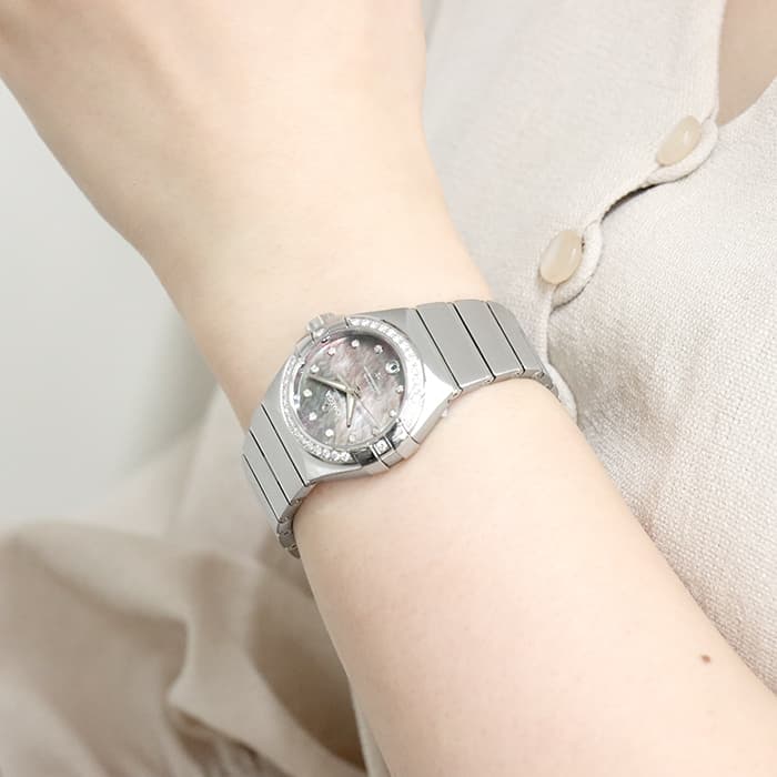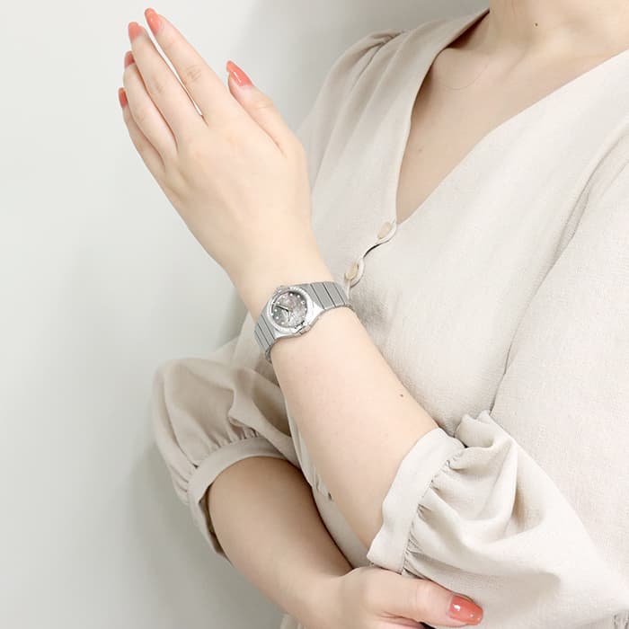 オメガの不朽の名作「コンステレーション」コレクションは3時と9時位置のベゼルの「爪」、6時位置の星マークがデザインの特徴です。素材や文字盤カラーなど豊富なバリエーションが展開されていますので、自分だけのお気に入りの1本が見つかるようになっています。こちらは使いやすいステンレス素材を使用し、ダイヤモンドを文字盤とベゼルに贅沢にセッティングしたラグジュアリーなモデル。文字盤には魅惑的に輝くタヒチ産のブラックシェルが使用されています。レディースラインではクォーツ式が多いコンステレーションですが、こちらには自動巻き式のムーブメントが搭載された機械式時計となります。クォーツ式には無いリューズを巻き上げて使う一手間で愛着がこみ上げてきます。洗練されたデザインで日常にエッセンスを与えてくれるおすすめの腕時計です。