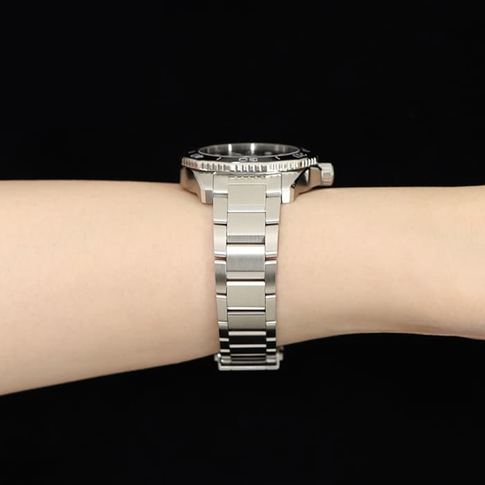 ダイバーズウォッチはサイズや厚さが大きいモデルが多い中であえて大きさを抑えシンプルなデザインにすることによりシーンを問わず着用できる点や、様々な動きにも対応したフィット感を演出することにより全く新しいダイバーズウォッチとしておススメの一本です。